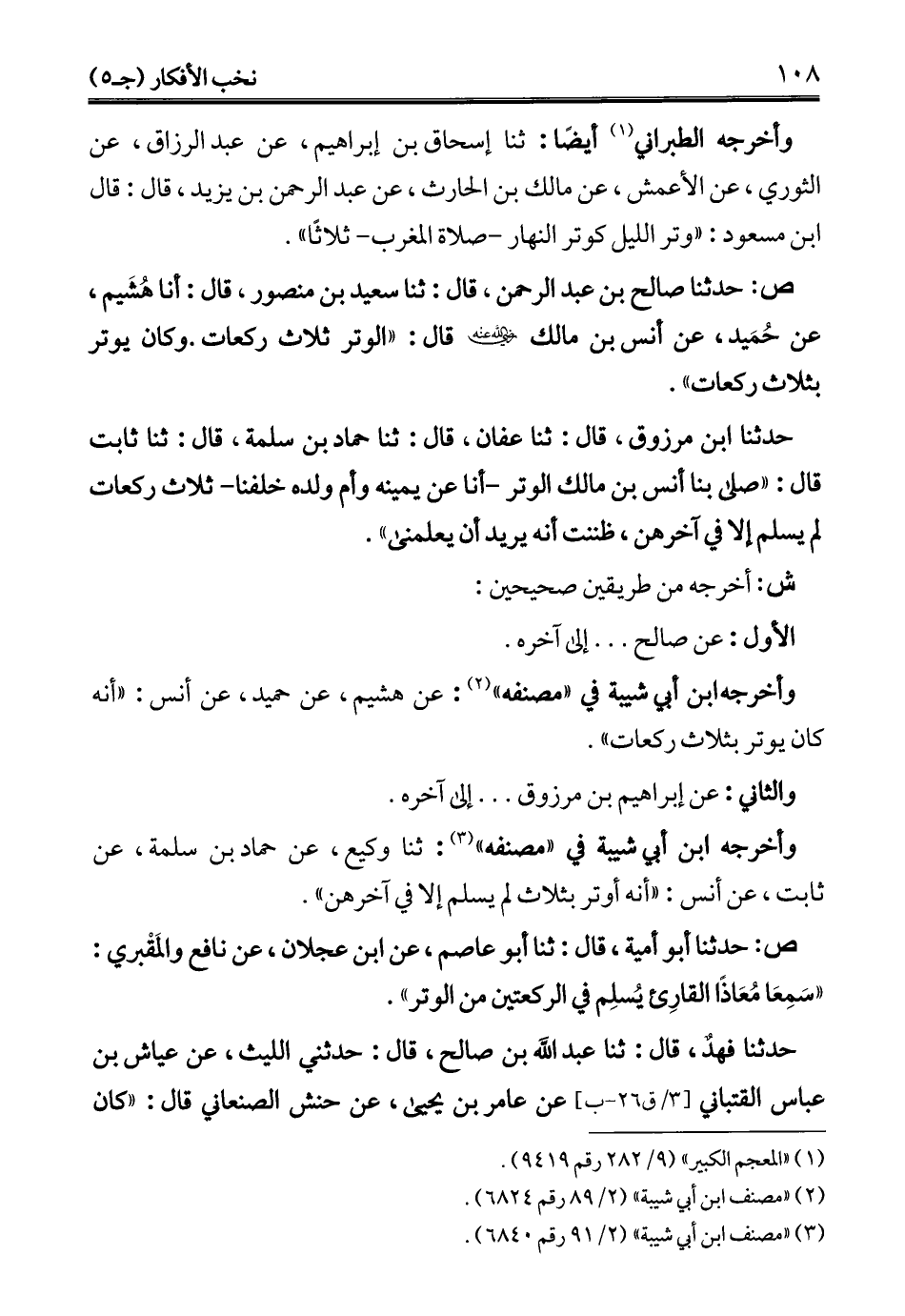 ص: حدثنا صالح بن عبد الرحمن، قال: ثنا سعيد بن منصور، قال: أنا هُشَيم، عن حُمَيد، عن أنس بن مالك - رضي الله عنه - قال: "الوتر ثلاث ركعات. وكان يوتر بثلاث ركعات".