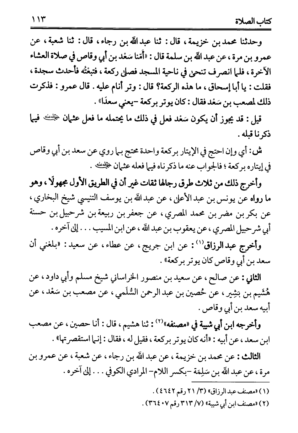 وحدثنا محمد بن خزيمة، قال: ثنا عبد الله بن رجاء، قال: ثنا شعبة، عن عمرو بن مرة، عن عبد الله بن سلمة قال: "أَمّنا سَعْد بن أبي وقاص في صلاة العشاء الآخرة، فلما انصرف تنحى في ناحية المسجد فصلى ركعة، فتبعْتُه فأحدث سجدة، فقلت: يا أبا إسحاق، ما هذه الركعة؟ قال: وتر أنام عليه. قال عمرو: فذكرت ذلك لمصعب بن سَعْد فقال: كان يوتر بركعة -يعني سعدًا".