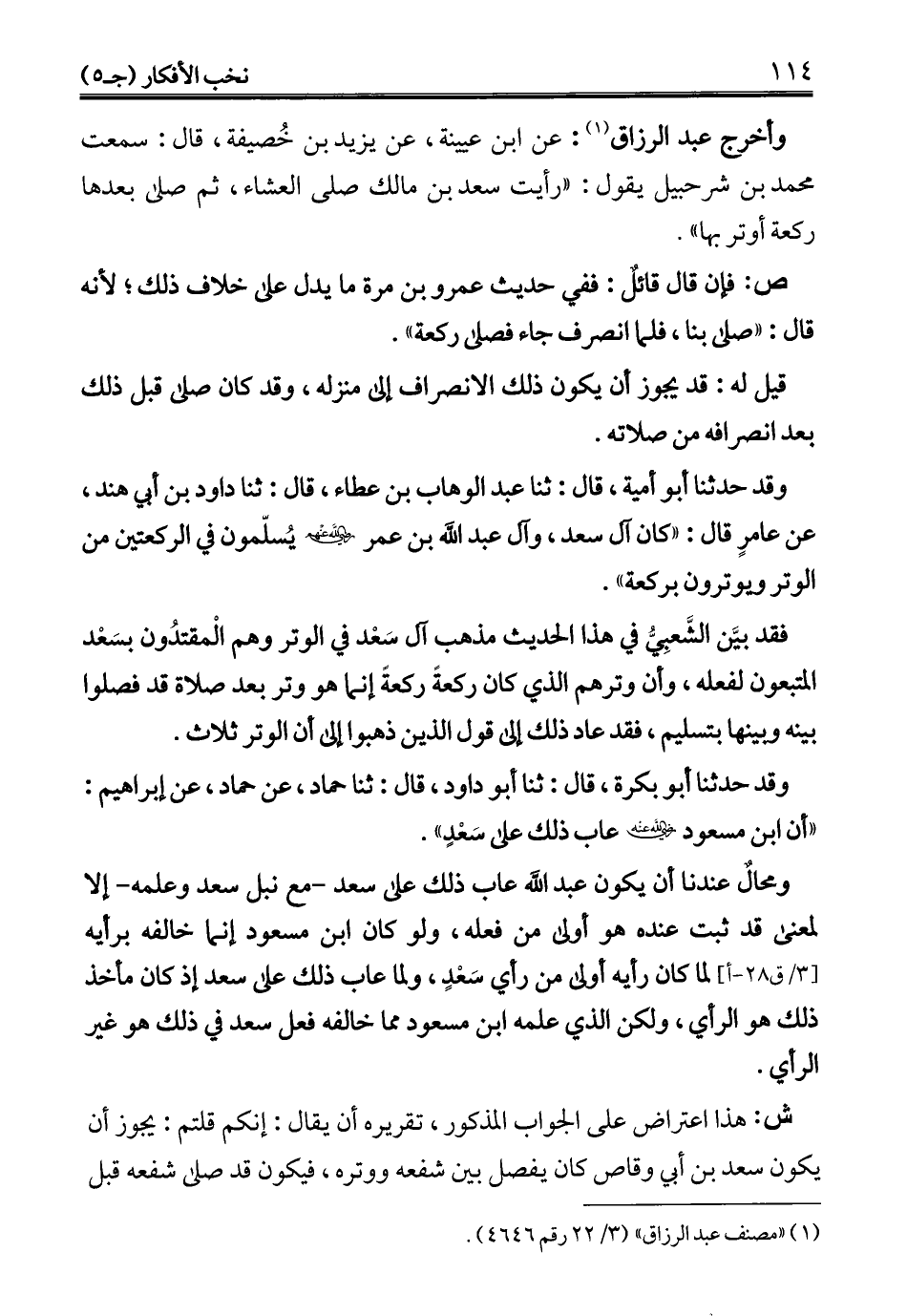 ش: هذا اعتراض على الجواب المذكور، تقريره أن يقال: إنكم قلتم: يجوز أن يكون سعد بن أبي وقاص كان يفصل بين شفعه ووتره، فيكون قد صلى شفعه قبل