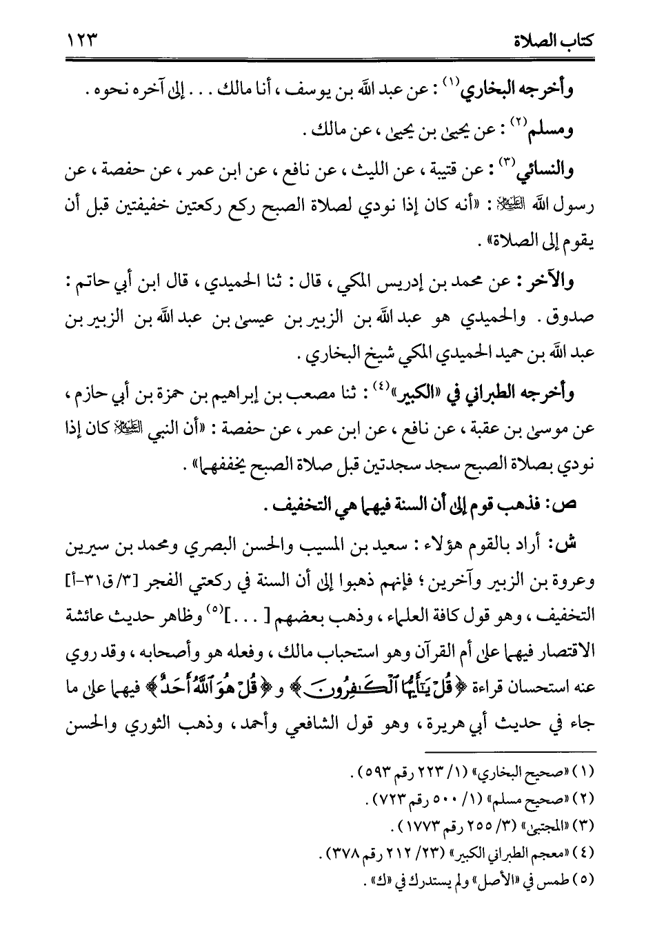 ش: أراد بالقوم هؤلاء: سعيد بن المسيب والحسن البصري ومحمد بن سيرين وعروة بن الزبير وآخرين؛ فإنهم ذهبوا إلى أن السنة في ركعتي الفجر التخفيف، وهو قول كافة العلماء، وذهب بعضهم [....] (¬5) وظاهر حديث عائشة الاقتصار فيهما على أم القرآن وهو استحباب مالك، وفعله هو وأصحابه، وقد روي عنه استحسان قراءة {قُلْ يَا أَيُّهَا الْكَافِرُونَ} و {قُلْ هُوَ اللَّهُ أَحَدٌ} فيهما على ما جاء في حديث أبي هريرة، وهو قول الشافعي وأحمد، وذهب الثوري والحسن