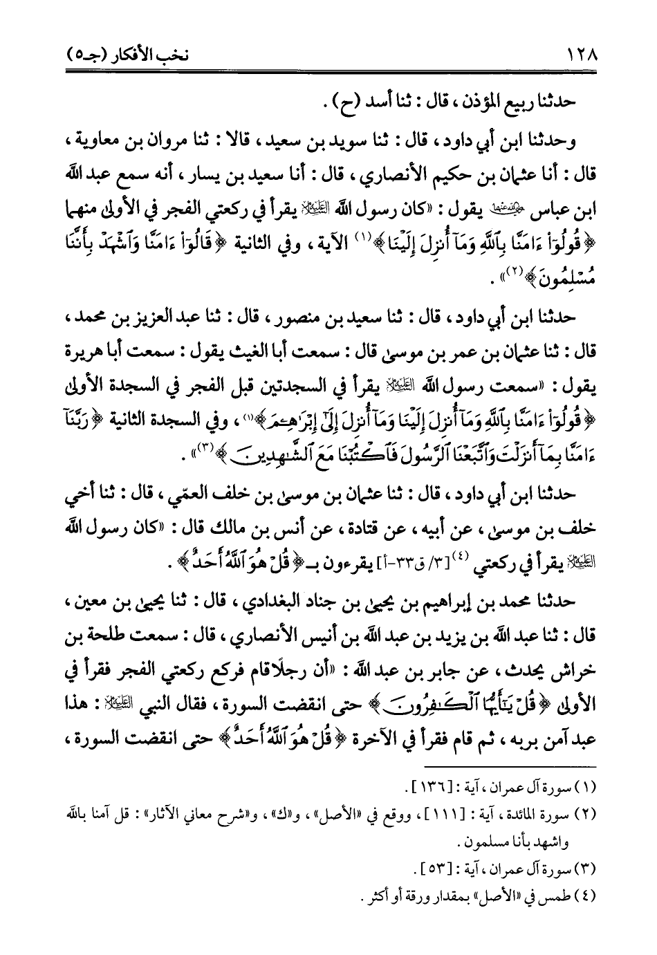 وحدثنا ابن أبي داود، قال: ثنا سويد بن سعيد، قالا: ثنا مروان بن معاوية، قال: أنا عثمان بن حكيم الأنصاري، قال: أنا سعيد بن يسار، أنه سمع عبد الله ابن عباس - رضي الله عنهما - يقول: "كان رسول الله - عليه السلام - يقرأ في ركعتي الفجر في الأولى منهما {قُولُوا آمَنَّا بِاللَّهِ وَمَا أُنْزِلَ إِلَيْنَا} (¬1) الآية، وفي الثانية {قَالُوا آمَنَّا وَاشْهَدْ بِأَنَّنَا مُسْلِمُونَ} (¬2) ".