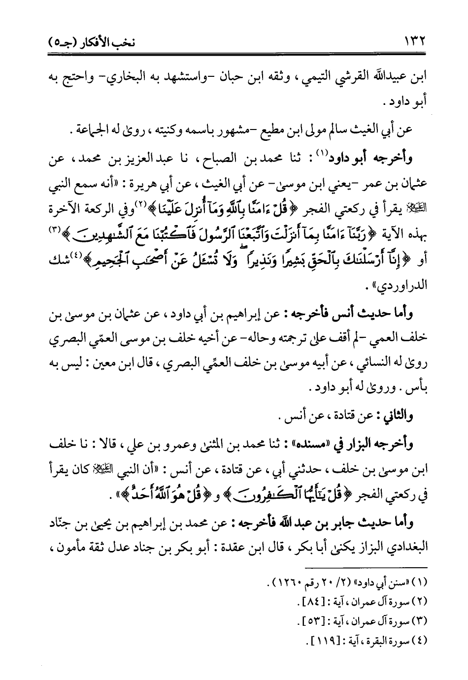 وأخرجه أبو داود (¬1): ثنا محمَّد بن الصباح، نا عبد العزيز بن محمَّد، عن عثمان بن عمر -يعني ابن موسى- عن أبي الغيث، عن أبي هريرة: "أنه سمع النبي - عليه السلام - يقرأ في ركعتي الفجر {قُلْ آمَنَّا بِاللَّهِ وَمَا أُنْزِلَ عَلَيْنَا} (¬2) وفي الركعة الآخرة بهذه الآية {رَبَّنَا آمَنَّا بِمَا أَنْزَلْتَ وَاتَّبَعْنَا الرَّسُولَ فَاكْتُبْنَا مَعَ الشَّاهِدِينَ} (¬3) أو {إِنَّا أَرْسَلْنَاكَ بِالْحَقِّ بَشِيرًا وَنَذِيرًا وَلَا تُسْأَلُ عَنْ أَصْحَابِ الْجَحِيمِ} (¬4) شك الدراوردي".
