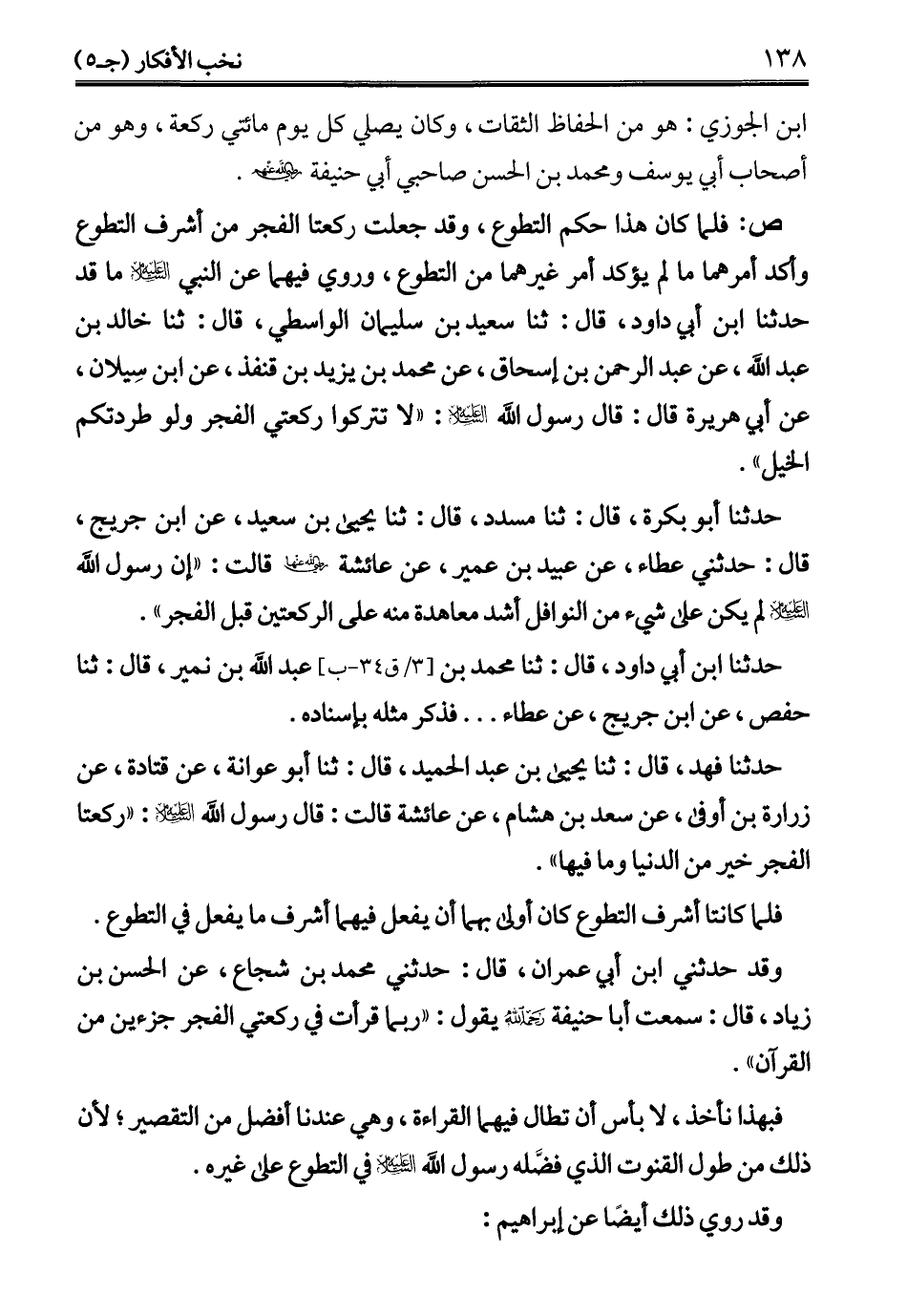 وقد حدثني ابن أبي عمران، قال: حدثني محمَّد بن شجاع، عن الحسن بن زياد، قال: سمعت أبا حنيفة -رحمه الله- يقول: "ربما قرأت في ركعتي الفجر جزءين من القرآن".