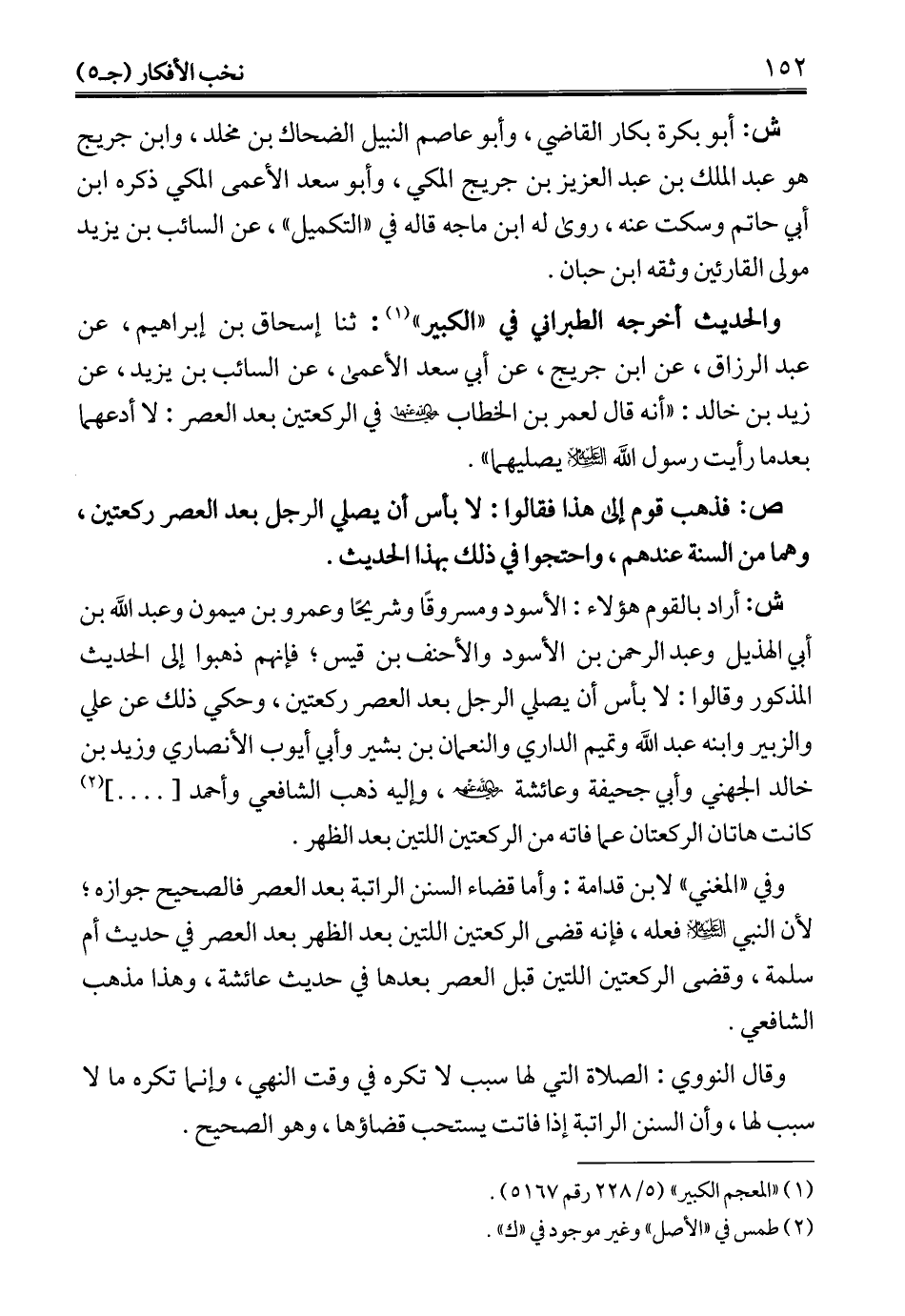 ش: أراد بالقوم هؤلاء: الأسود ومسروقًا وشريحًا وعمرو بن ميمون وعبد الله بن أبي الهذيل وعبد الرحمن بن الأسود والأحنف بن قيس؛ فإنهم ذهبوا إلى الحديث المذكور وقالوا: لا بأس أن يصلي الرجل بعد العصر ركعتين، وحكي ذلك عن علي والزبير وابنه عبد الله وتميم الداري والنعمان بن بشير وأبي أيوب الأنصاري وزيد بن خالد الجهني وأبي جحيفة وعائشة - رضي الله عنهم -، وإليه ذهب الشافعي وأحمد [....] (¬2) كانت هاتان الركعتان عما فاته من الركعتين اللتين بعد الظهر.