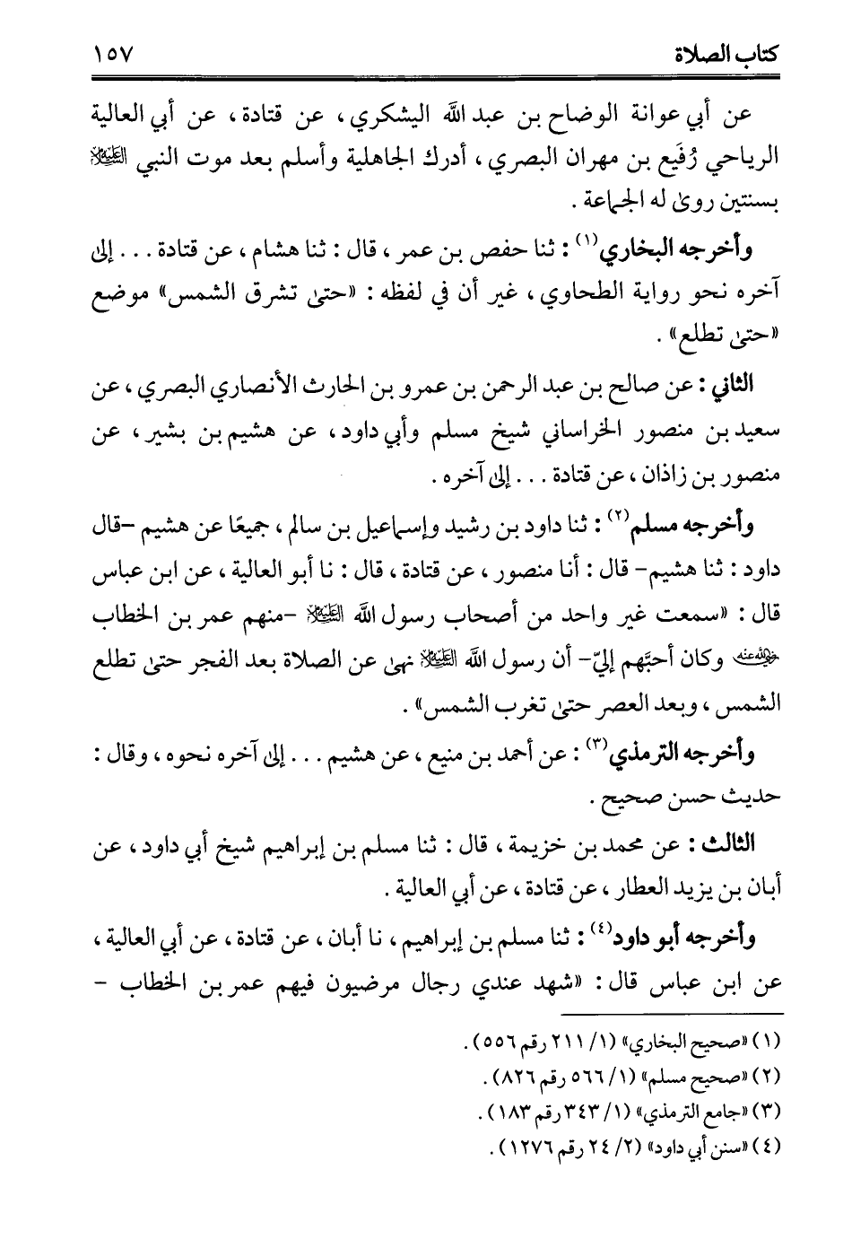 وأخرجه مسلم (¬2): ثنا داود بن رشيد وإسماعيل بن سالم، جميعًا عن هشيم -قال داود: ثنا هشيم- قال: أنا منصور، عن قتادة، قال: نا أبو العالية، عن ابن عباس قال: "سمعت غير واحد من أصحاب رسول الله - عليه السلام - منهم عمر بن الخطاب - رضي الله عنه - وكان أحبَّهم إليّ - أن رسول الله - عليه السلام - نهى عن الصلاة بعد الفجر حتى تطلع الشمس، وبعد العصر حتى تغرب الشمس".