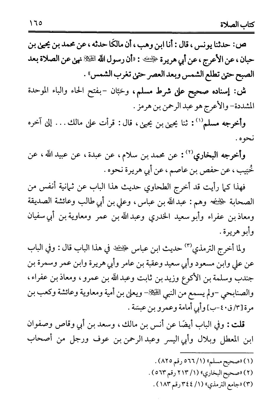 ص: حدثنا يونس، قال: أنا ابن وهب، أن مالكًا حدثه، عن محمَّد بن يحيى بن حبان، عن الأعرج، عن أبي هريرة - رضي الله عنه -: "أن رسول الله - عليه السلام - نهى عن الصلاة بعد الصبح حتى تطلع الشمس وبعد العصر حتى تغرب الشمس".