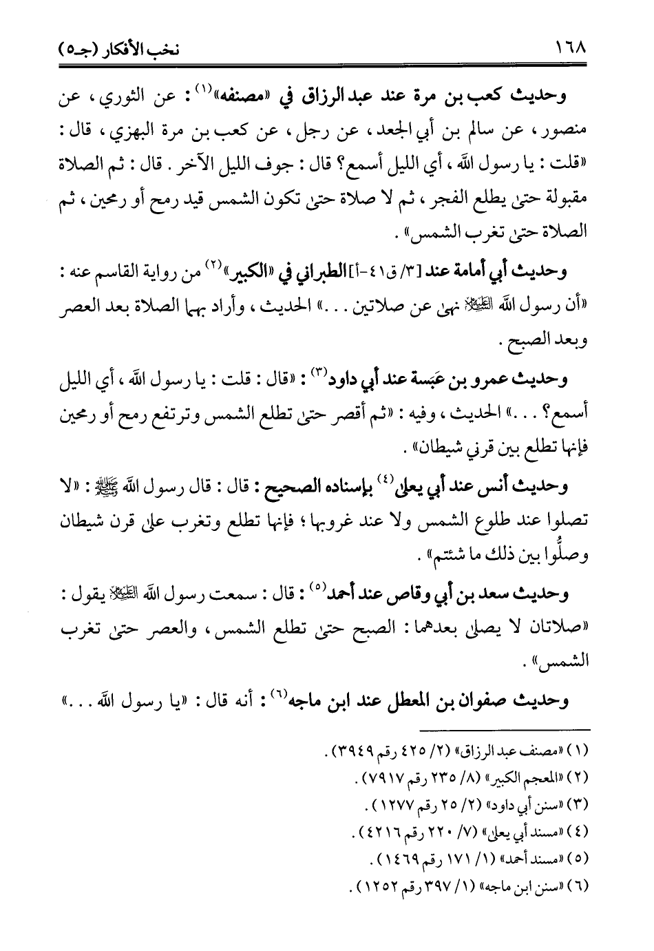وحديث كعب بن مرة عند عبد الرزاق في "مصنفه" (¬1): عن الثوري، عن منصور، عن سالم بن أبي الجعد، عن رجل، عن كعب بن مرة البهزي، قال: "قلت: يا رسول الله، أي الليل أسمع؟ قال: جوف الليل الآخر. قال: ثم الصلاة مقبولة حتى يطلع الفجر، ثم لا صلاة حتى تكون الشمس قيد رمح أو رمحين، ثم الصلاة حتى تغرب الشمس".