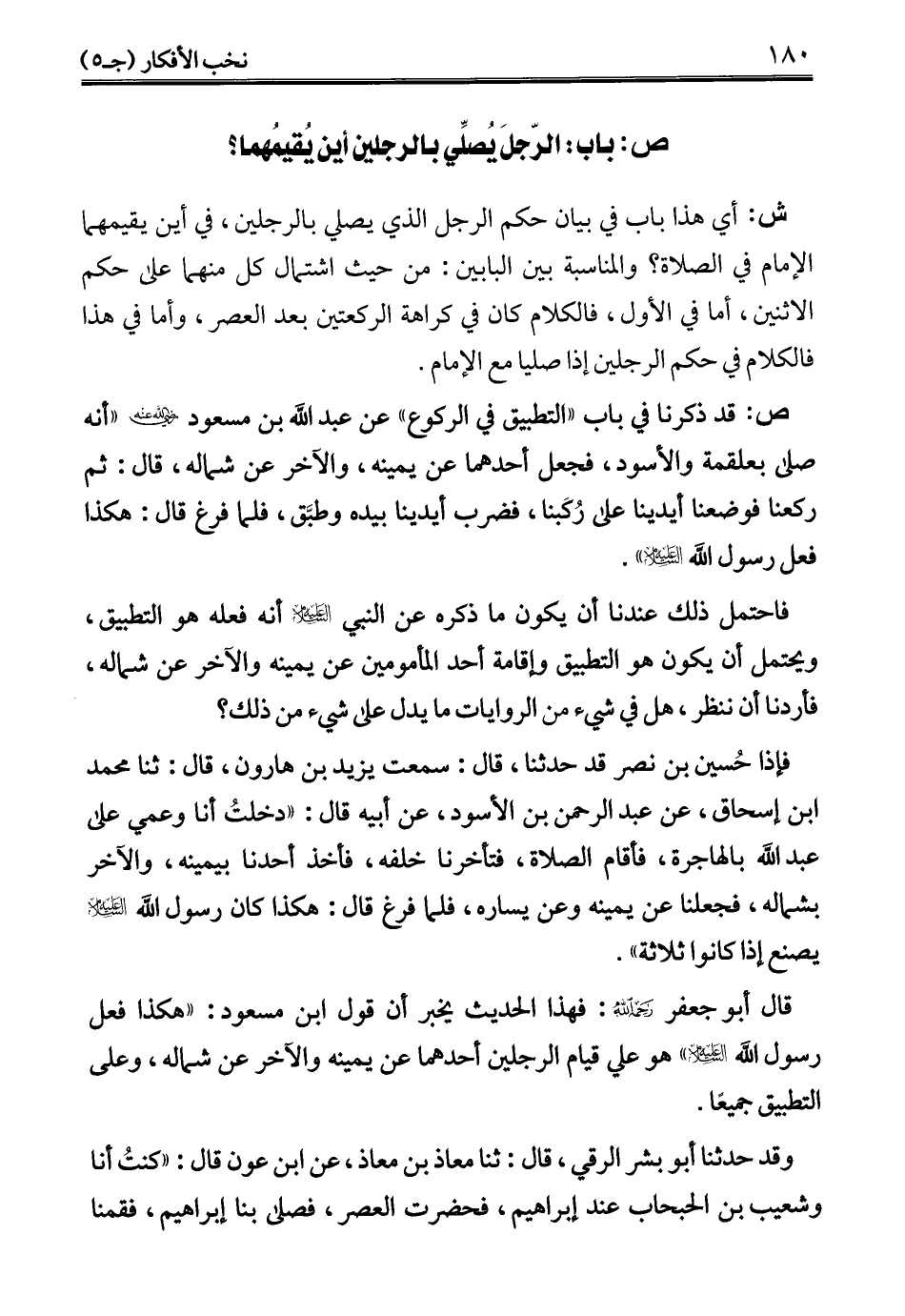 فإذا حُسين بن نصر قد حدثنا، قال: سمعت يزيد بن هارون، قال: ثنا محمَّد ابن إسحاق، عن عبد الرحمن بن الأسود، عن أبيه قال: "دخلتُ أنا وعمي على عبد الله بالهاجرة، فأقام الصلاة، فتأخرنا خلفه، فأخذ أحدنا بيمينه، والآخر بشماله، فجعلنا عن يمينه وعن يساره، فلما فرغ قال: هكذا كان رسول الله - عليه السلام - يصنع إذا كانوا ثلاثة".