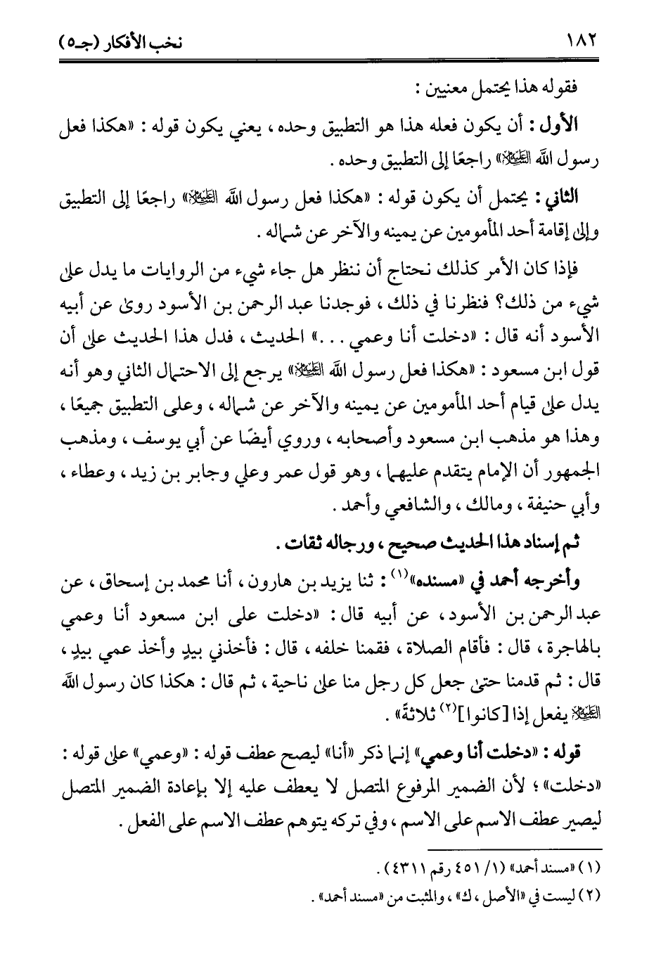 فإذا كان الأمر كذلك نحتاج أن ننظر هل جاء شيء من الروايات ما يدل على شيء من ذلك؟ فنظرنا في ذلك، فوجدنا عبد الرحمن بن الأسود روى عن أبيه الأسود أنه قال: "دخلت أنا وعمي ... " الحديث، فدل هذا الحديث على أن قول ابن مسعود: "هكذا فعل رسول الله - عليه السلام -" يرجع إلى الاحتمال الثاني وهو أنه يدل على قيام أحد المأمومين عن يمينه والآخر عن شماله، وعلى التطبيق جميعًا، وهذا هو مذهب ابن مسعود وأصحابه، وروي أيضًا عن أبي يوسف، ومذهب الجمهور أن الإِمام يتقدم عليهما، وهو قول عمر وعلي وجابر بن زيد، وعطاء، وأبي حنيفة، ومالك، والشافعي وأحمد.