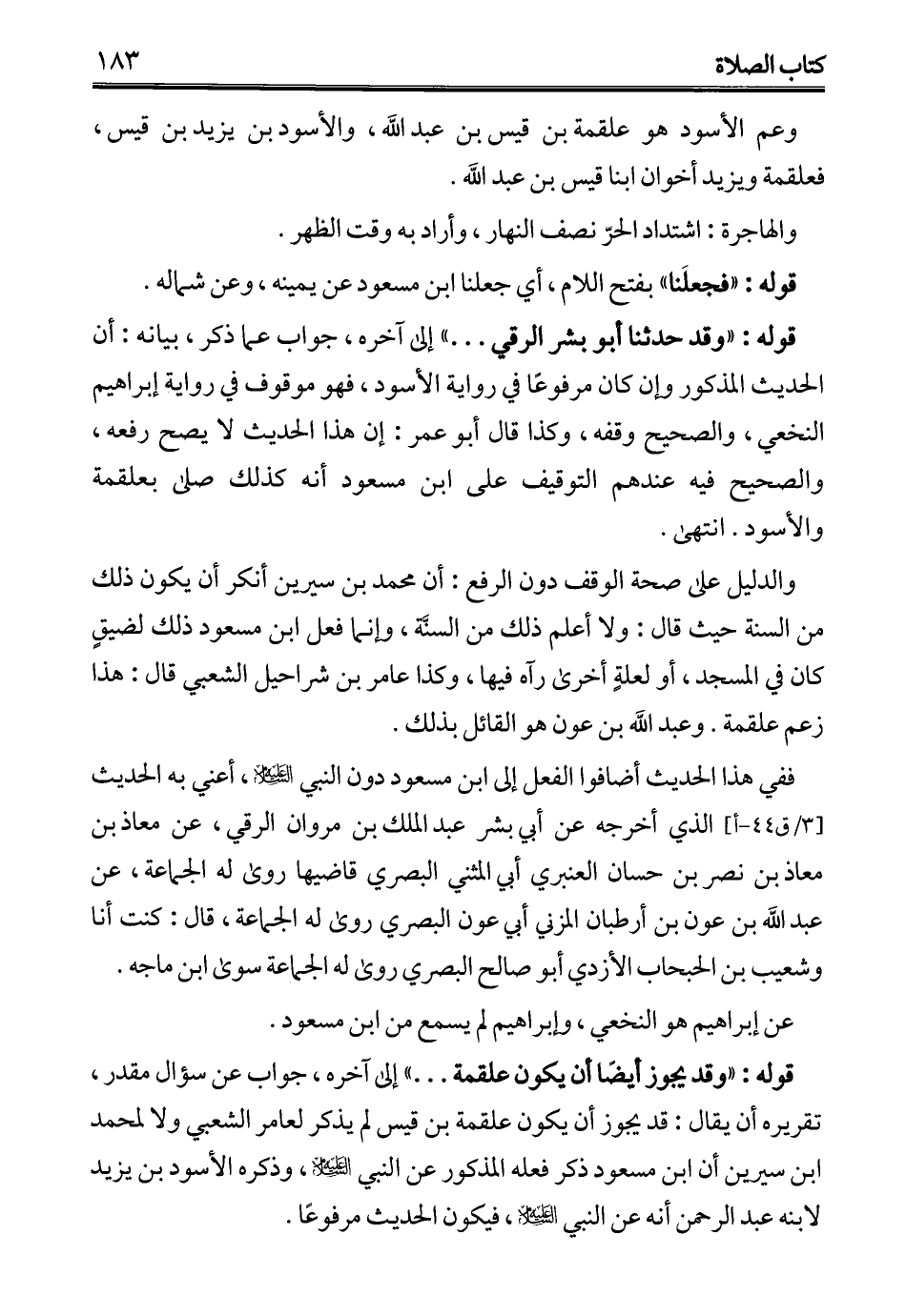 قوله: "وقد حدثنا أبو بشر الرقي ... " إلى آخره، جواب عما ذكر، بيانه: أن الحديث المذكور وإن كان مرفوعًا في رواية الأسود، فهو موقوف في رواية إبراهيم النخعي، والصحيح وقفه، وكذا قال أبو عمر: إن هذا الحديث لا يصح رفعه، والصحيح فيه عندهم التوقيف على ابن مسعود أنه كذلك صلى بعلقمة والأسود. انتهى.