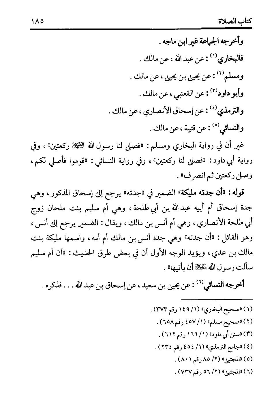 غير أن في رواية البخاري ومسلم: "فصلى لنا رسول الله - عليه السلام - ركعتين" وفي رواية أبي داود: "فصلى لنا ركعتين"، وفي رواية النسائي: "قوموا فأصلي لكم، وصلى ركعتين ثم انصرف".