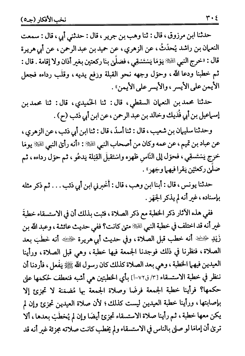 حدثنا ابن مرزوق، قال: ثنا وهب بن جرير، قال: حدثني أبي، قال: سمعت النعمان بن راشد يُحدِّثُ، عن الزهري، عن حميد بن عبد الرحمن، عن أبي هريرة قال: "خرج النبي - عليه السلام - يَوْمًا يَسْتَسْقِي، فصَلَّى بنَا ركعتين بغير أذان ولا إقامة. قال: ثم خطبنا ودعا الله، وحوّل وجهه نحو القبلة صرَفع يديه، وقلَب رداءه فجعل الأيمن على الأيسر، والأيسر على الأيمن".