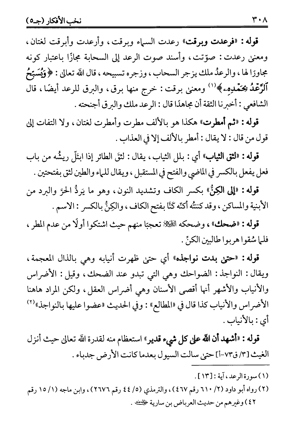 قوله: "أشهد أن الله على كل شيء قدير" استعظام منه لقدرة الله تعالى حيث أنزل الغيث حتى سالت السيول بعد ما كانت الأرض جدباء.