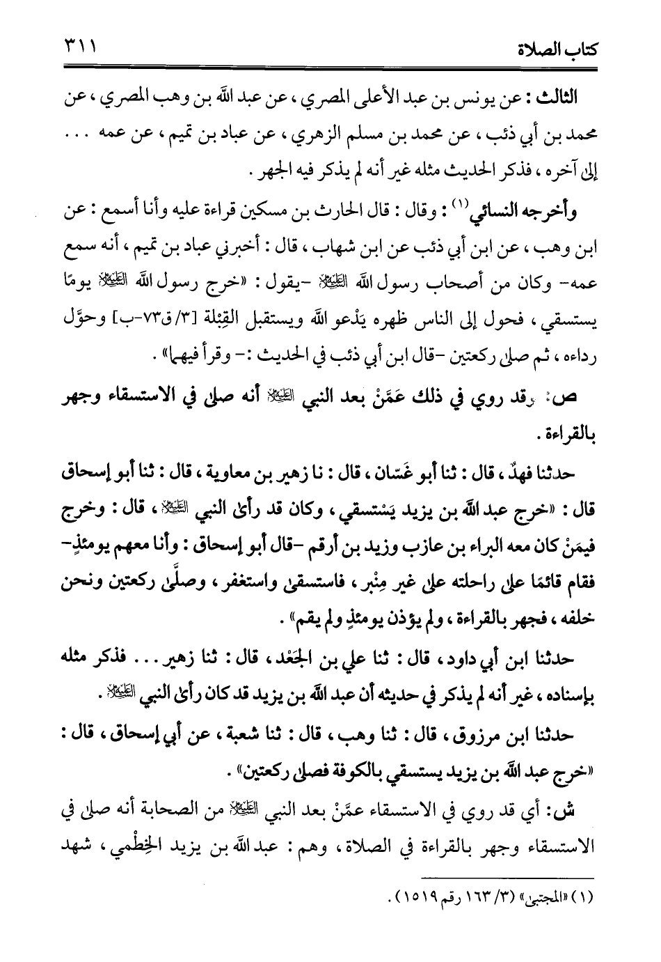 حدثنا فهدٌ، قال: ثنا أبو غَسّان، قال: ثا زهير بن معاوية، قال: ثنا أبو إسحاق قال: "خرج عبد الله بن يزيد يَسْتسقي، وكان قد رأى النبي - عليه السلام -، قال: وخرج فيمَنْ كان معه البراء بن عازب وزيد بن أرقم -قال أبو إسحاق: وأنا معهم يومئذٍ- فقام قائمًا على راحلته على غير مِنْبر، فاستسقى واستغفر، وصلَّى ركعتين ونحن خلفه، فجهر بالقراءة، ولم يؤذن يومئذٍ ولم يقم".