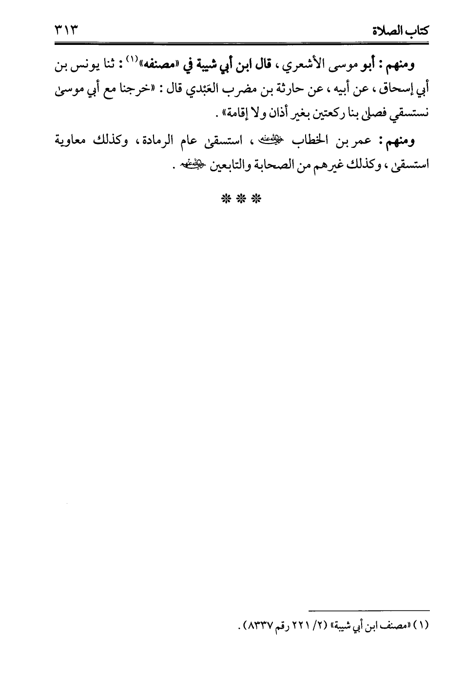ومنهم: أبو موسى الأشعري، قال ابن أبي شيبة في "مصنفه" (¬1): ثنا يونس بن أبي إسحاق، عن أبيه، عن حارثة بن مضرب العَبدي قال: "خرجنا مع أبي موسى نستسقي فصلَّى بنا ركعتين بغير أذان ولا إقامة".