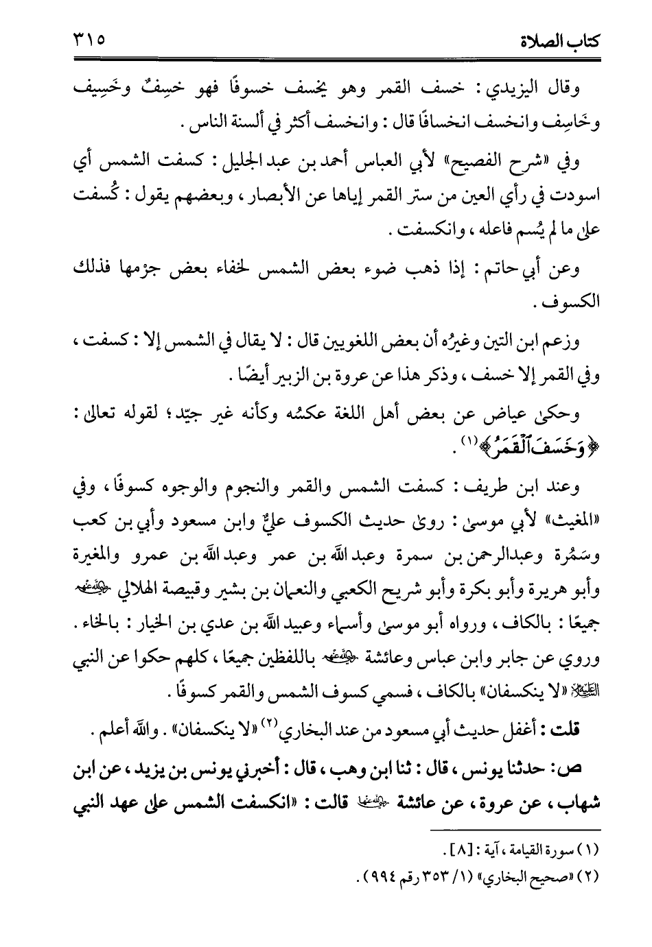وزعم ابن التين وغيرُه أن بعض اللغويين قال: لا يقال في الشمس إلا: كسفت، وفي القمر إلا خسف، وذكر هذا عن عروة بن الزبير أيضًا.