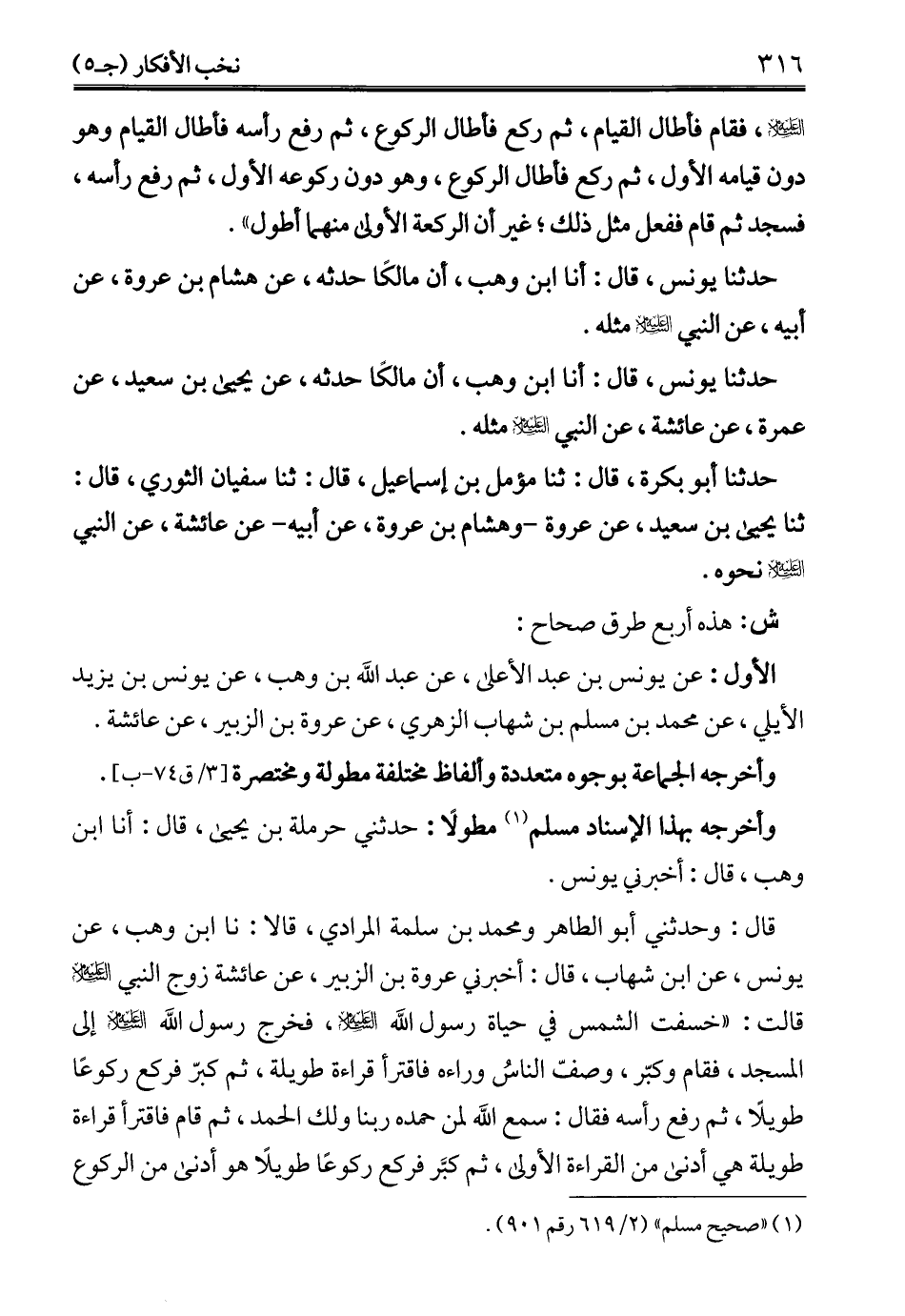 قال: وحدثني أبو الطاهر ومحمد بن سلمة المرادي، قالا: نا ابن وهب، عن يونس، عن ابن شهاب، قال: أخبرني عروة بن الزبير، عن عائشة زوج النبي - عليه السلام - قالت: "خسفت الشمس في حياة رسول الله - عليه السلام -، فخرج رسول الله - عليه السلام - إلى المسجد، فقام وكبّر، وصفّ الناسُ وراءه فاقترأ قراءة طويلة، ثم كبرّ فركع ركوعًا طويلًا، ثم رفع رأسه فقال: سمع الله لمن حمده ربنا ولك الحمد، ثم قام فاقترأ قراءة طويلة هي أدنى من القراءة الأولى، ثم كبَّر فركع ركوعًا طويلًا هو أدنى من الركوع