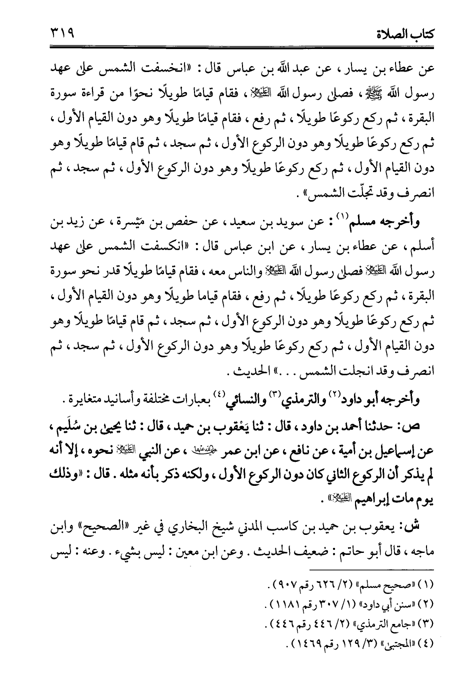 عن عطاء بن يسار، عن عبد الله بن عباس قال: "انخسفت الشمس على عهد رسول الله - عليه السلام -، فصلى رسول الله - عليه السلام - فقام قيامًا طويلًا نحوًا من قراءة سورة البقرة، ثم ركع ركوعًا طويلًا، ثم رفع، فقام قيامًا طويلًا وهو دون القيام الأول، ثم ركع ركوعًا طويلًا وهو دون الركوع الأول، ثم سجد، ثم قام قيامًا طويلًا وهو دون القيام الأول، ثم ركع ركوعًا طويلًا وهو دون الركوع الأول، ثم سجد، ثم انصرف وقد تجلّت الشمس".