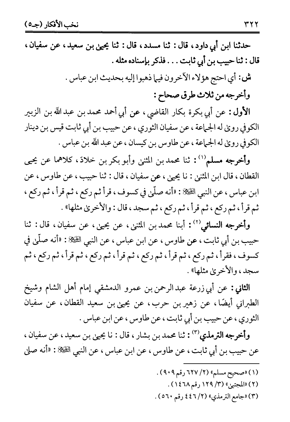 وأخرجه النسائي (¬2): أبنا محمَّد بن المثنى، عن يحيى، عن سفيان، قال: ثنا حبيب بن أبي ثابت، عن طاوس، عن ابن عباس، عن النبي - عليه السلام -: "أنه صلّى في كسوف، فقرأ، ثم ركع، ثم قرأ، ثم ركع، ثم قرأ، ثم ركع، ثم قرأ، ثم ركع، ثم سجد، والأخرى مثلها".
