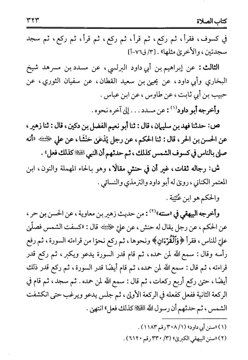 وأخرجه البيهقي في "سننه" (¬2): من حديث زهير بن معاوية، عن الحسن بن حر، عن الحكم، عن رجل يقال له حنش، عن عليّ - رضي الله عنه - قال: "كسفت الشمس فصلّى عليّ للناس، فقرأ {وَالْقُرْآنِ} وونحوها، ثم ركع نحوًا من قراءته السورة، ثم رفع رأسه وقال: سمع الله لمن حمده، ثم قام قدر السورة يدعو ويكبر، ثم ركع قدر قراءته، ثم قال: سمع الله لمن حمده، ثم قام أيضًا قدر السورة، ثم ركع قدر ذلك أيضًا، حتى ركع أربع ركعات، ثم قال: سمع الله لمن حمده. ثم سجد، ثم قام في الركعة الثانية ففعل كفعله في الركعة الأولى، ثم جلس يدعو ويرغب حتى انكشفت الشمس، ثم حدثهم أن رسول الله - عليه السلام - كذلك فعل" انتهى.