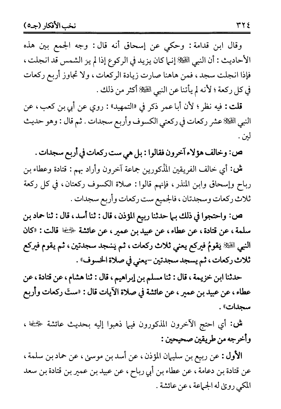 وقال ابن قدامة: وحكي عن إسحاق أنه قال: وجه الجمع بين هذه الأحاديث: أن النبي - عليه السلام - إنما كان يزيد في الركوع إذا لم يرَ الشمس قد انجلت، فإذا انجلت سجد، فمن ها هنا صارت زيادة الركعات، ولا تجاوز أربع ركعات في كل ركعة؛ لأنه لم يأتنا عن النبي - عليه السلام - أكثر من ذلك.