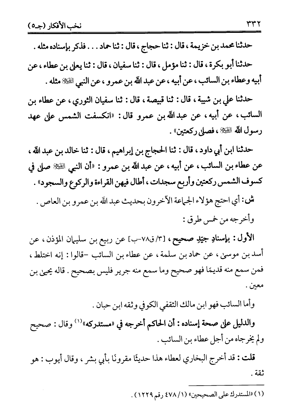 حدثنا علي بن شيبة، قال: ثنا قبيصة، قال: ثنا سفيان الثوري، عن عطاء بن السائب، عن أبيه، عن عبد الله بن عمرو قال: "انكسفت الشمس على عهد رسول الله - عليه السلام - فصلى ركعتين".