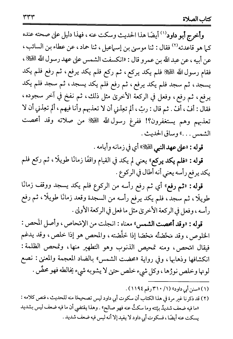 وأخرج أبو داود (¬1) أيضًا هذا الحديث وسكت عنه، فهذا دليل على صحته عنده كما هو قاعدته (¬2) فقال: ثنا موسى بن إسماعيل، ثنا حماد، عن عطاء بن السائب، عن أبيه، عن عبد الله بن عمرو قال: "انكسفت الشمس على عهد رسول الله - عليه السلام - فقام رسول الله - عليه السلام - فلم يكد يركع، ثم ركع فلم يكد يرفع، ثم رفع فلم يكد يسجد، ثم سجد فلم يكد يرفع، ثم رفع فلم يكد يسجد، ثم سجد فلم يكد يرفع، ثم رفع، وفعل في الركعة الأخرى مثل ذلك، ثم نفخ في آخر سجوده، فقال: أفْ، أفْ. ثم قال: ربِّ، ألم تعِدْني أن لا تعذبهم وأنا فيهم، ألم تعِدْني أن لا تعذبهم وهم يستغفرون؟! ففرغ رسول الله - عليه السلام - من صلاته وقد أمحصت الشمس ... " وساق الحديث.