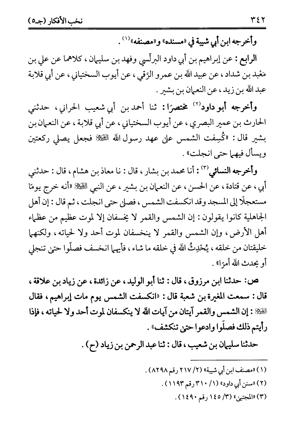 وأخرجه أبو داود (¬2) مختصرًا: ثنا أحمد بن أبي شعيب الحراني، حدثني الحارث بن عمير البصري، عن أيوب السختياني، عن أبي قلابة، عن النعمان بن بشير قال: "كُسِفت الشمس على عهد رسول الله - عليه السلام - فجعل يصلى ركعتين ويسأل فيهما حتى انجلت".