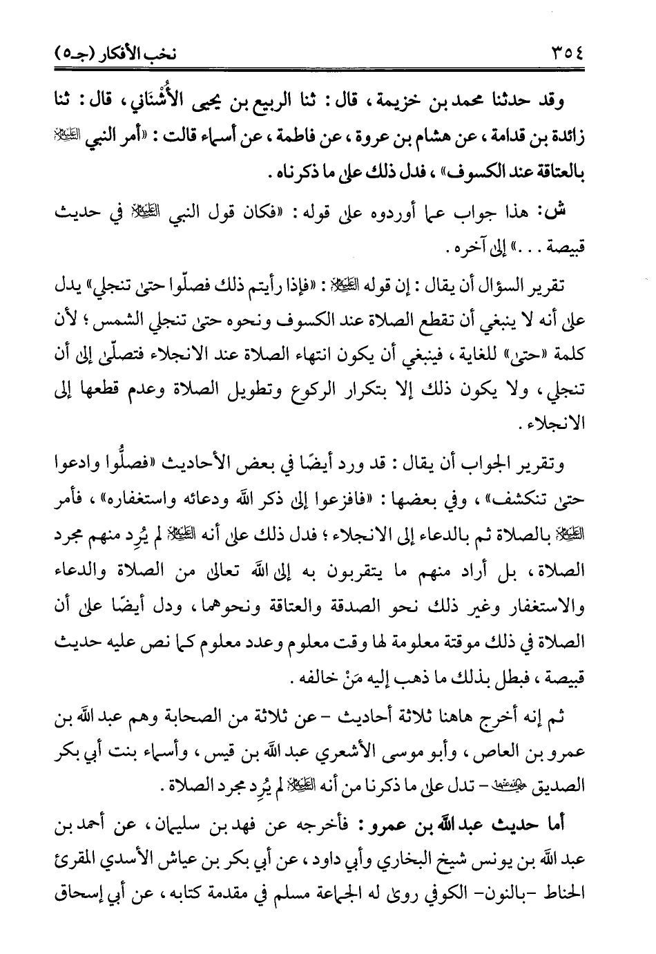 وتقرير الجواب أن يقال: قد ورد أيضًا في بعض الأحاديث "فصلُّوا وادعوا حتى تنكشف"، وفي بعضها: "فافزعوا إلى ذكر الله ودعائه واستغفاره"، فأمر - عليه السلام - بالصلاة ثم بالدعاء إلى الانجلاء؛ فدل ذلك على أنه - عليه السلام - لم يُرِد منهم مجرد الصلاة، بل أراد منهم ما يتقربون به إلى الله تعالى من الصلاة والدعاء والاستغفار وغير ذلك نحو الصدقة والعتاقة ونحوهما، ودل أيضًا على أن الصلاة في ذلك موقتة معلومة لها وقت معلوم وعدد معلوم كما نص عليه حديث قبيصة، فبطل بذلك ما ذهب إليه مَنْ خالفه.