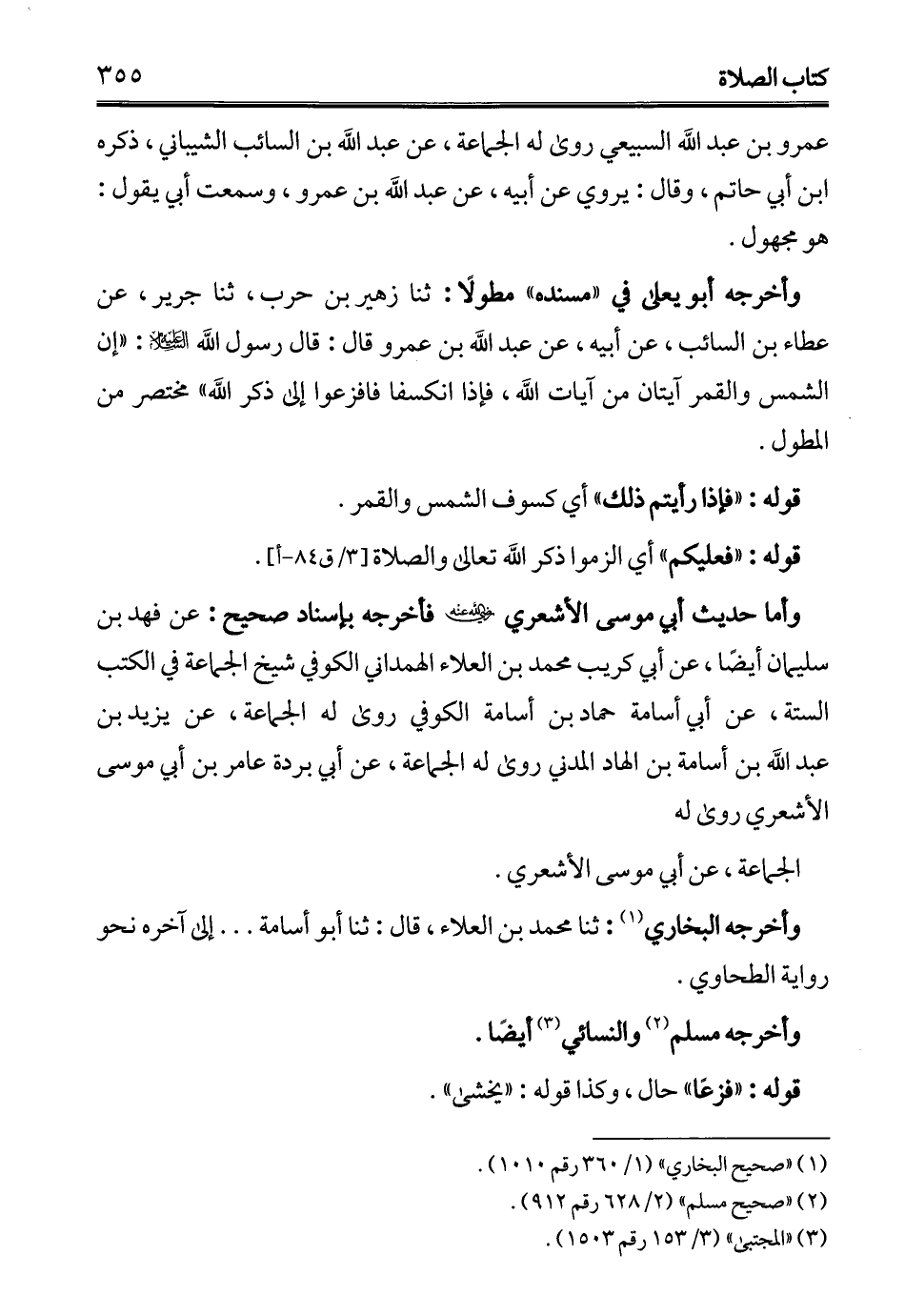 وأخرجه أبو يعلى في "مسنده" مطولًا: ثنا زهير بن حرب، ثنا جرير، عن عطاء بن السائب، عن أبيه، عن عبد الله بن عمرو قال: قال رسول الله - عليه السلام -: "إن الشمس والقمر آيتان من آيات الله، فإذا انكسفا فافزعوا إلى، ذكر الله" مختصر من المطول.