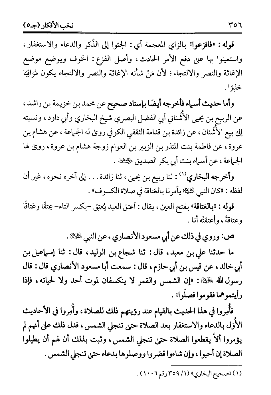 وأخرجه البخاري (¬1): ثنا ربيع بن يحيى، ثنا زائدة ... إلى آخره نحوه، غير أن لفظه: "كان النبي - عليه السلام - يأمرنا بالعَتاقة في صلاة الكسوف".