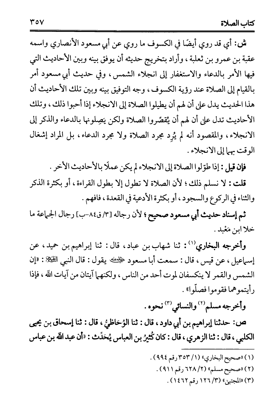 ش: أي قد روي أيضًا في الكسوف ما روي عن أبي مسعود الأنصاري واسمه عقبة بن عمرو بن ثعلبة، وأراد بتخريج حديثه أن يوفق بينه وبين الأحاديث التي فيها الأمر بالدعاء والاستغفار إلى انجلاء الشمس، وفي حديث أبي مسعود أمر بالقيام إلى الصلاة عند رؤية الكسوف، وجه التوفيق بينه وبين تلك الأحاديث أن هذا الحديث يدل على أن لهم أن يطيلوا الصلاة إلى الانجلاء إذا أحبوا ذلك، وتلك الأحاديث تدل على أن لهم أن يُقصِّروا الصلاة ولكن يَصِلونها بالدعاء والذكر إلى الانجلاء، والمقصود أنه لم يُرِد مجرد الصلاة ولا مجرد الدعاء، بل المراد إشغال الوقت بهما إلى الانجلاء.