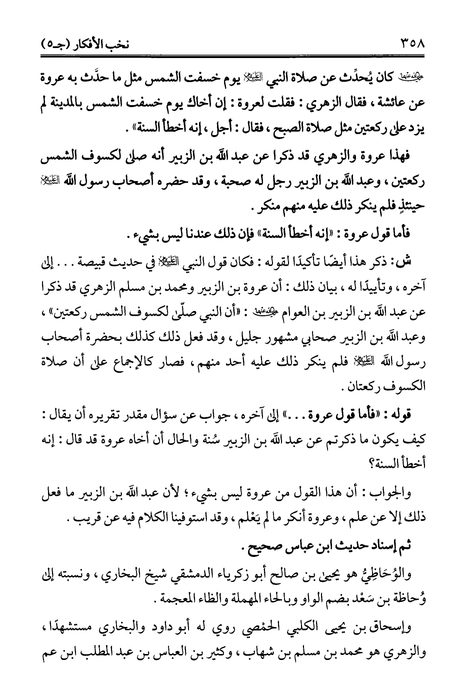 - رضي الله عنهما - كان يُحدِّث عن صلاة النبي - عليه السلام - يوم خسفت الشمس مثل ما حدَّث به عروة عن عائشة، فقال الزهري: فقلت لعروة: إن أخاك يوم خسفت الشمس بالمدينة لم يزد على ركعتين مثل صلاة الصبح، فقال: أجل، إنه أخطأ السنة".