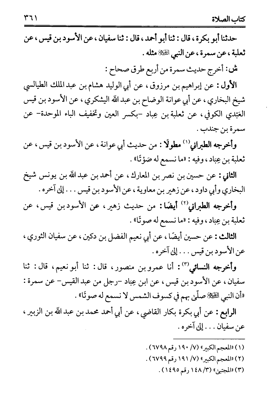وأخرجه النسائي (¬3): أنا عمرو بن منصور، قال: ثنا أبو نعيم، قال: ثنا سفيان، عن الأسود بن قيس، عن ابن عِبَاد -رجل من عبد القيس- عن سمرة: "أن النبي - عليه السلام - صلّى بهم في كسوف الشمس لا نسمع له صوتًا".