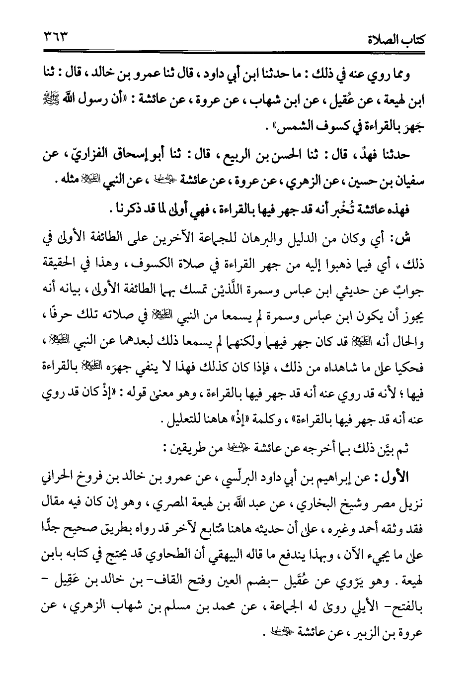 ومما روي عنه في ذلك: ما حدثنا ابن أبي داود، قال ثنا عمرو بن خالد، قال: ثنا ابن لهيعة، عن عُقيل، عن ابن شهاب، عن عروة، عن عائشة - رضي الله عنها -: "أن رسول الله - عليه السلام - جَهرَ بالقراءة في كسوف الشمس".