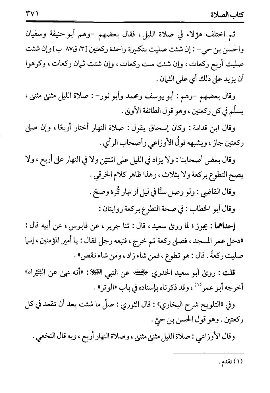 ثم اختلف هؤلاء في صلاة الليل، فقال بعضهم -وهم أبو حنيفة وسفيان والحسن بن حي-: إن شئت صليت بتكبيرة واحدة ركعتين وإن شئت صليت أربع ركعات، وإن شئت ست ركعات، وإن شئت ثمان ركعات، وكرهوا أن يزيد على ذلك أي على الثمان.
