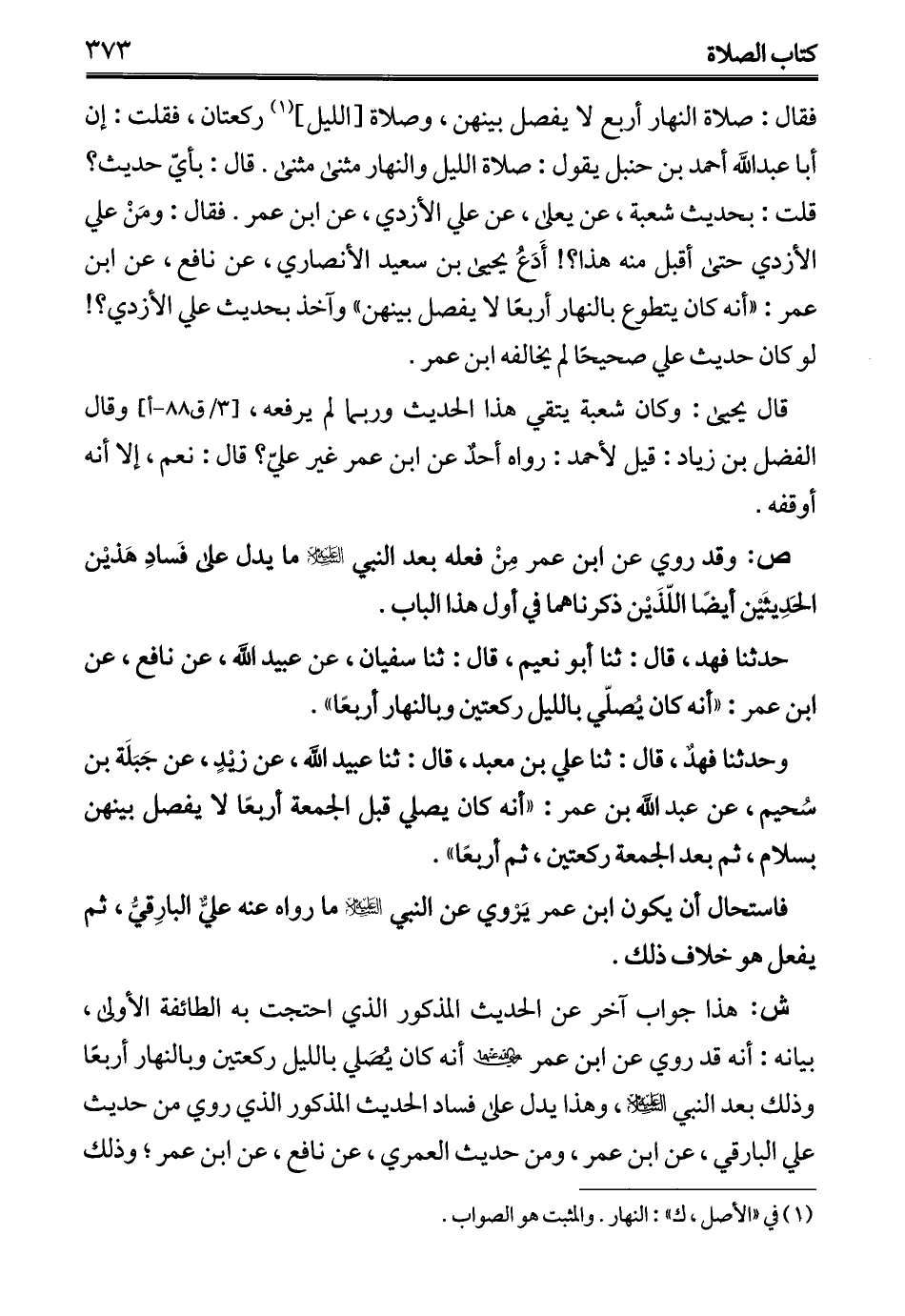 فقال: صلاة النهار أربع لا يفصل بينهن، وصلاة [الليل] (¬1) ركعتان، فقلت: إن أبا عبد الله أحمد بن حنبل يقول: صلاة الليل والنهار مثنى مثنى. قال: بأيّ حديث؟ قلت: بحديث شعبة، عن يعلى، عن علي الأزدي، عن ابن عمر. فقال: ومَنْ علي الأزدي حتى أقبل منه هذا؟! أَدَعُ يحيى بن سعيد الأنصاري، عن نافع، عن ابن عمر: "أنه كان يتطوع بالنهار أربعًا لا يفصل بينهن" وآخذ بحديث علي الأزدي؟! لو كان حديث علي صحيحًا لم يخالفه ابن عمر.