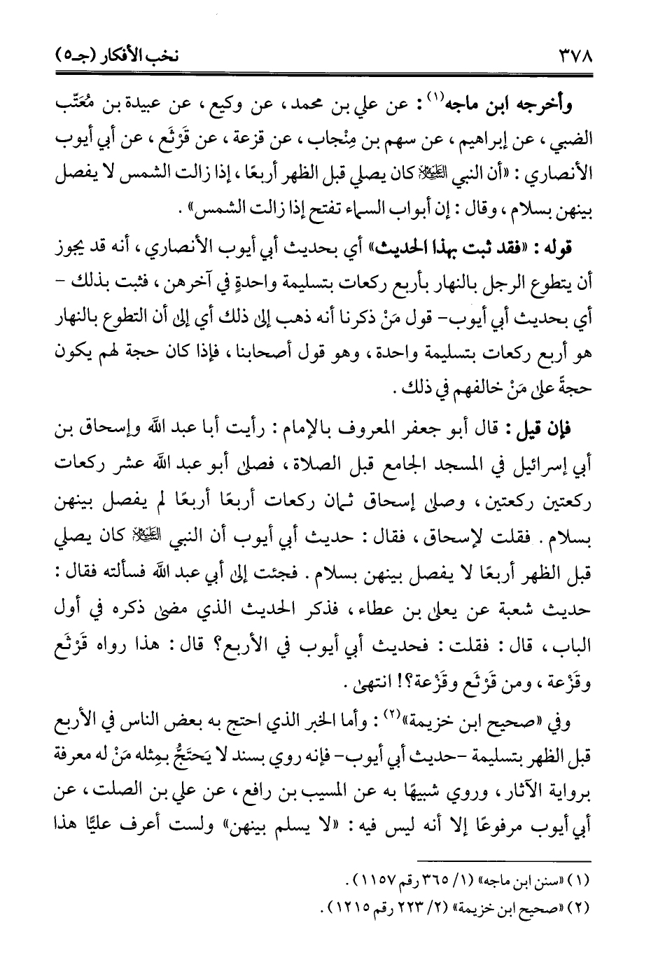 وفي "صحيح ابن خزيمة" (¬2): وأما الخبر الذي احتج به بعض الناس في الأربع قبل الظهر بتسليمة -حديث أبي أيوب- فإنه روي بسند لا يَحتَجُّ بمِثله مَنْ له معرفة برواية الآثار، وروي شبيهًا به عن المسيب بن رافع، عن علي بن الصلت، عن أبي أيوب مرفوعًا إلا أنه ليس فيه: "لا يسلم بينهن" ولست أعرف عليًّا هذا