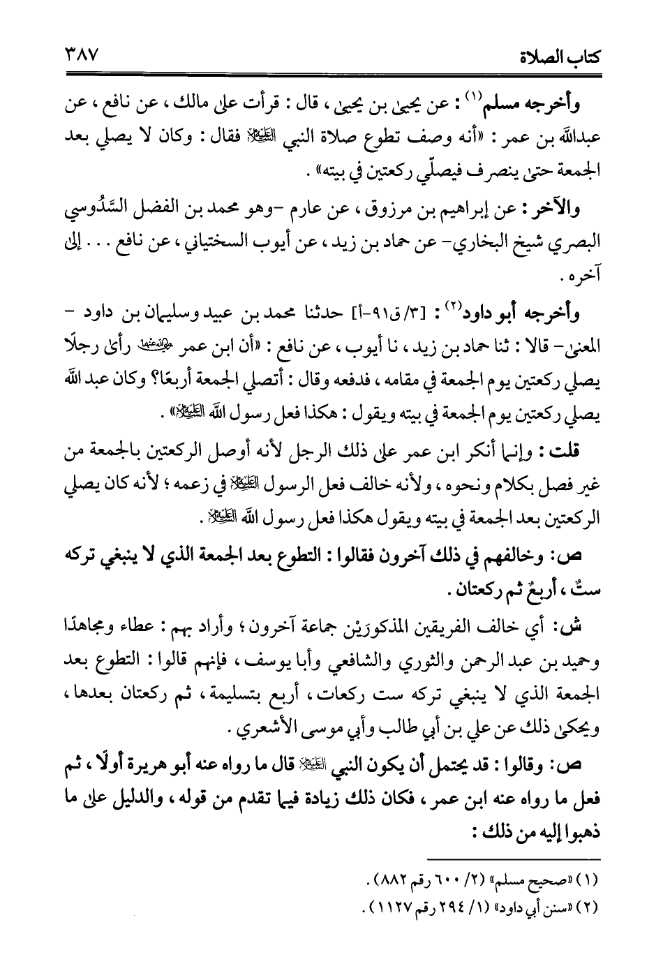 وأخرجه أبو داود (¬2): حدثنا محمَّد بن عبيد وسليمان بن داود -المعنى- قالا: ثنا حماد بن زيد، نا أيوب، عن نافع: "أن ابن عمر - رضي الله عنهما - رأى رجلًا يصلي ركعتين يوم الجمعة في مقامه، فدفعه وقال: أتصلي الجمعة أربعًا؟ وكان عبد الله يصلي ركعتين يوم الجمعة في بيته ويقول: هكذا فعل رسول الله - عليه السلام -".