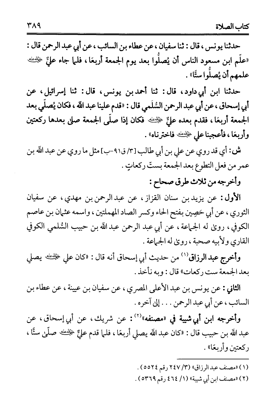 حدثنا ابن أبي داود، قال: ثنا أحمد بن يونس، قال: ثنا إسرائيل، عن أبي إسحاق، عن أبي عبد الرحمن السُّلَمي قال: "قدم علينا عبد الله، فكان يُصلّي بعد الجمعة أربعًا، فقدم بعده عليٌّ - رضي الله عنه - فكان إذا صلّى الجمعة صلى بعدها ركعتين وأربعًا، فأعجبنا علي - رضي الله عنه - فاخترناه".