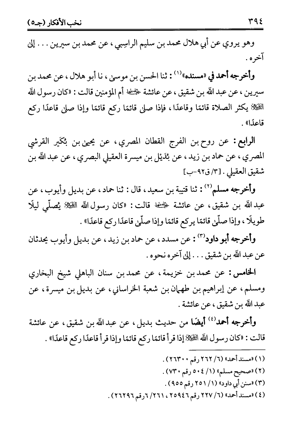 وأخرجه أحمد في "مسنده" (¬1): ثنا الحسن بن موسى، نا أبو هلال، عن محمَّد بن سيرين، عن عبد الله بن شقيق، عن عائشة - رضي الله عنها - أم المؤمنين قالت: "كان رسول الله - عليه السلام - يكثر الصلاة قائمًا وقاعدًا، فإذا صلى قائمًا ركع قائمًا وإذا صلى قاعدًا ركع قاعدًا".