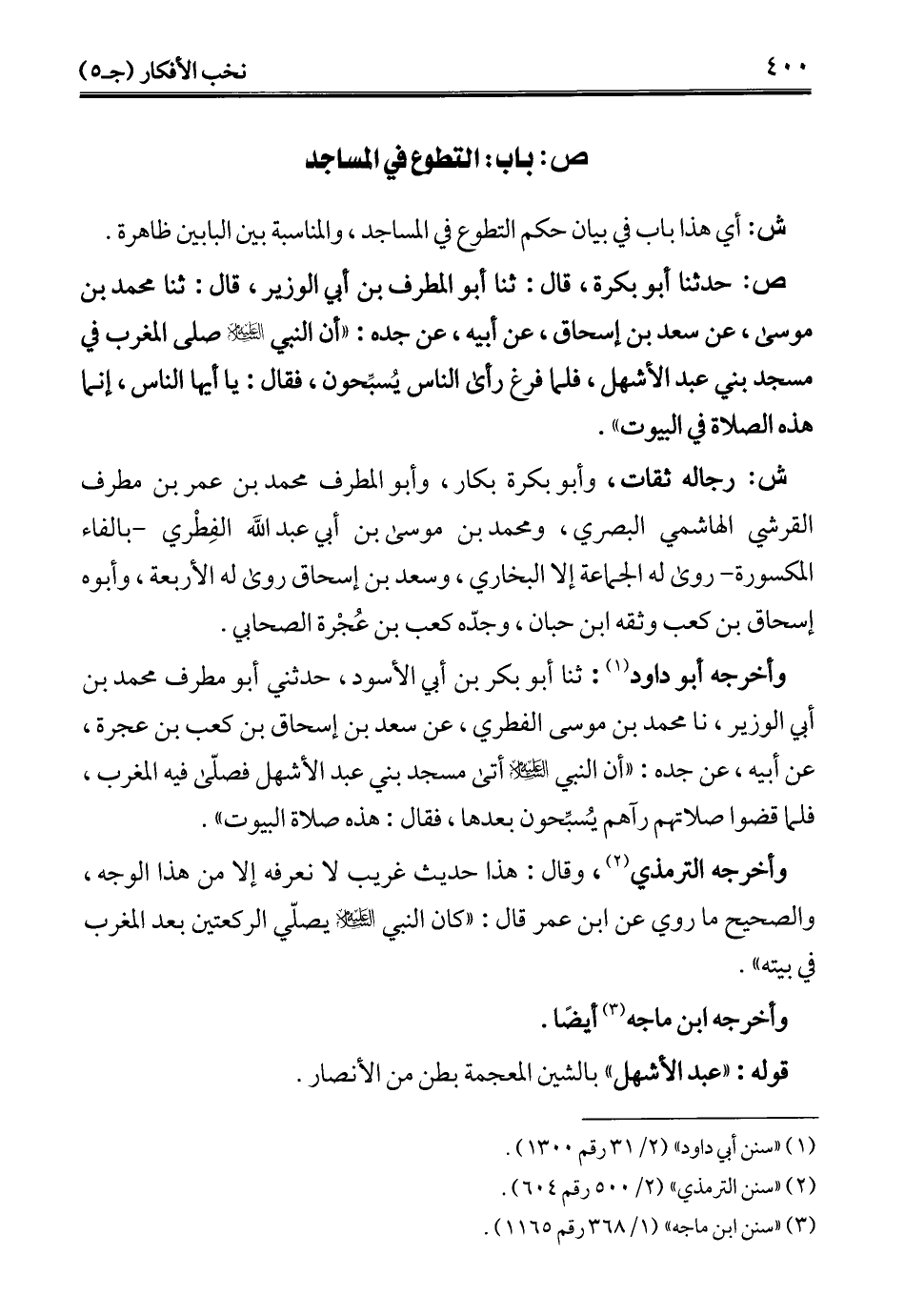 وأخرجه أبو داود (¬1): ثنا أبو بكر بن أبي الأسود، حدثني أبو مطرف محمَّد بن أبي الوزير، نا محمَّد بن موسى الفطري، عن سعد بن إسحاق بن كعب بن عجرة، عن أبيه، عن جده: "أن النبي - عليه السلام - أتى مسجد بني عبد الأشهل فصلّى فيه المغرب، فلما قضوا صلاتهم رآهم يُسبِّحون بعدها، فقال: هذه صلاة البيوت".