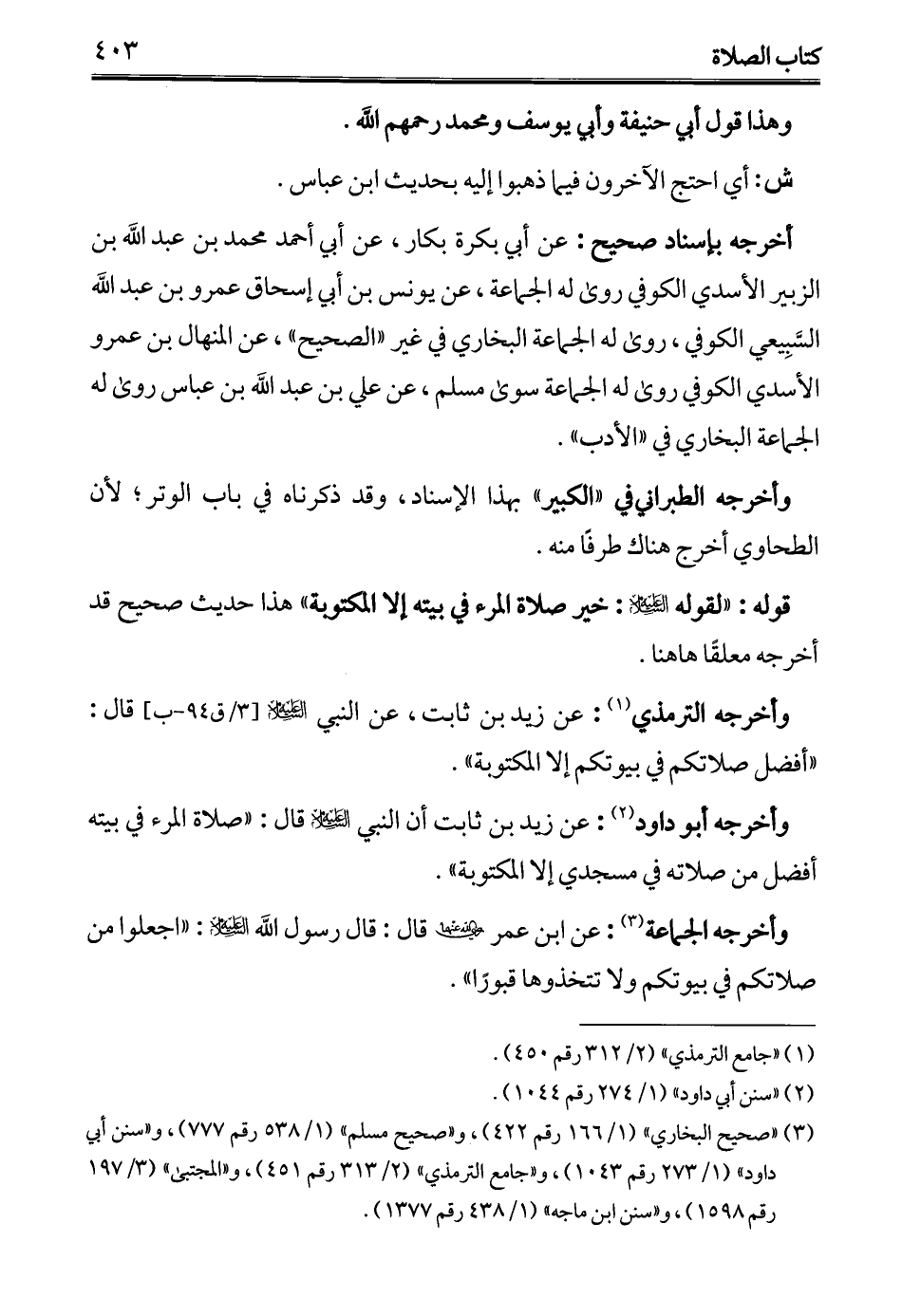 (¬3) "صحيح البخاري" (1/ 166 رقم 422)، و"صحيح مسلم" (1/ 538 رقم 777)، و"سنن أبي داود" (1/ 273 رقم 1043)، و"جامع الترمذي" (2/ 313 رقم 451)، و"المجتبى" (3/ 197 رقم 1598)، و"سنن ابن ماجه" (1/ 438 رقم 1377).