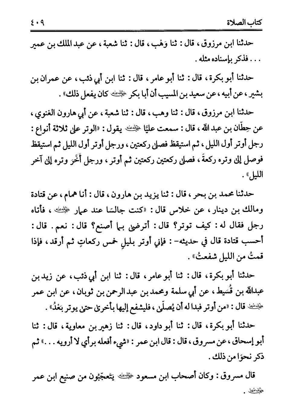حدثنا ابن مرزوق، قال: ثنا وهب، قال: ثنا شعبة، عن أبي هارون الغنوي، عن حِطّان بن عبد الله، قال: سمعت عليًّا - رضي الله عنه - يقول: "الوتر على ثلاثة أنواع: رجل أوتر أول الليل، ثم استيقظ فصلى ركعتين، ورجل أوتر أول الليل ثم استيقظ فوصل إلى وتره ركعةً، فصلى ركعتين ركعتين ثم أوتر، ورجل أَخَّرَ وتره إلى آخر الليل".