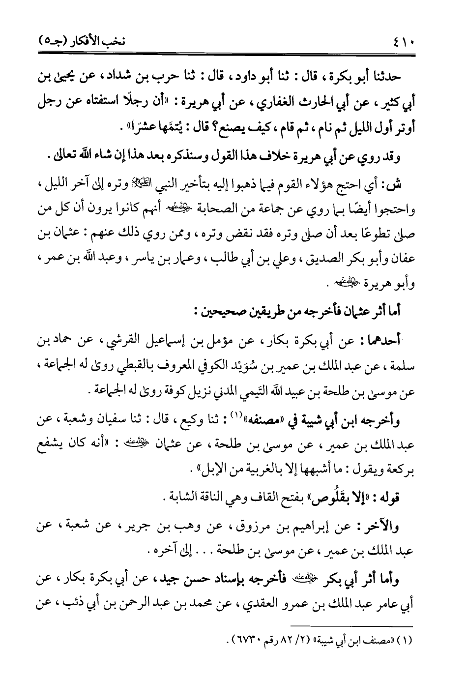 ش: أي احتج هؤلاء القوم فيما ذهبوا إليه بتأخير النبي - عليه السلام - وتره إلى آخر الليل، واحتجوا أيضًا بما روي عن جماعة من الصحابة - رضي الله عنهم - أنهم كانوا يرون أن كل من صلى تطوعًا بعد أن صلى وتره فقد نقض وتره، وممن روي ذلك عنهم: عثمان بن عفان وأبو بكر الصديق، وعلي بن أبي طالب، وعمار بن ياسر، وعبد الله بن عمر، وأبو هريرة - رضي الله عنهم -.