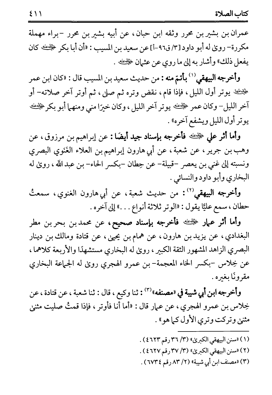 وأخرجه ابن أبي شيبة في "مصنفه" (¬3): ثنا وكيع، قال: ثنا شعبة، عن قتادة، عن خِلاس بن عمرو الهجري، عن عمار قال: "أما أنا فأوتر، فإذا قمتُ صليت مثنى مثنى وتركت وتري الأول كما هو".