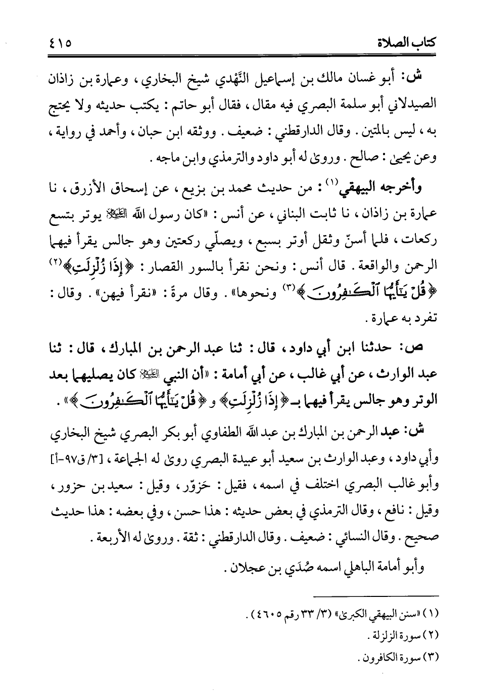 وأخرجه البيهقي (¬1): من حديث محمَّد بن بزيع، عن إسحاق الأزرق، نا عمارة بن زاذان، نا ثابت البناني، عن أنس: "كان رسول الله - عليه السلام - يوتر بتسع ركعات، فلما أسنّ وثقل أوتر بسبع، ويصلّي ركعتين وهو جالس يقرأ فيهما الرحمن والواقعة. قال أنس: ونحن نقرأ بالسور القصار: {إِذَا زُلْزِلَتِ} (¬2) {قُلْ يَا أَيُّهَا الْكَافِرُونَ} (¬3) ونحوها". وقال مرة: "نقرأ فيهن". وقال: تفرد به عمارة.