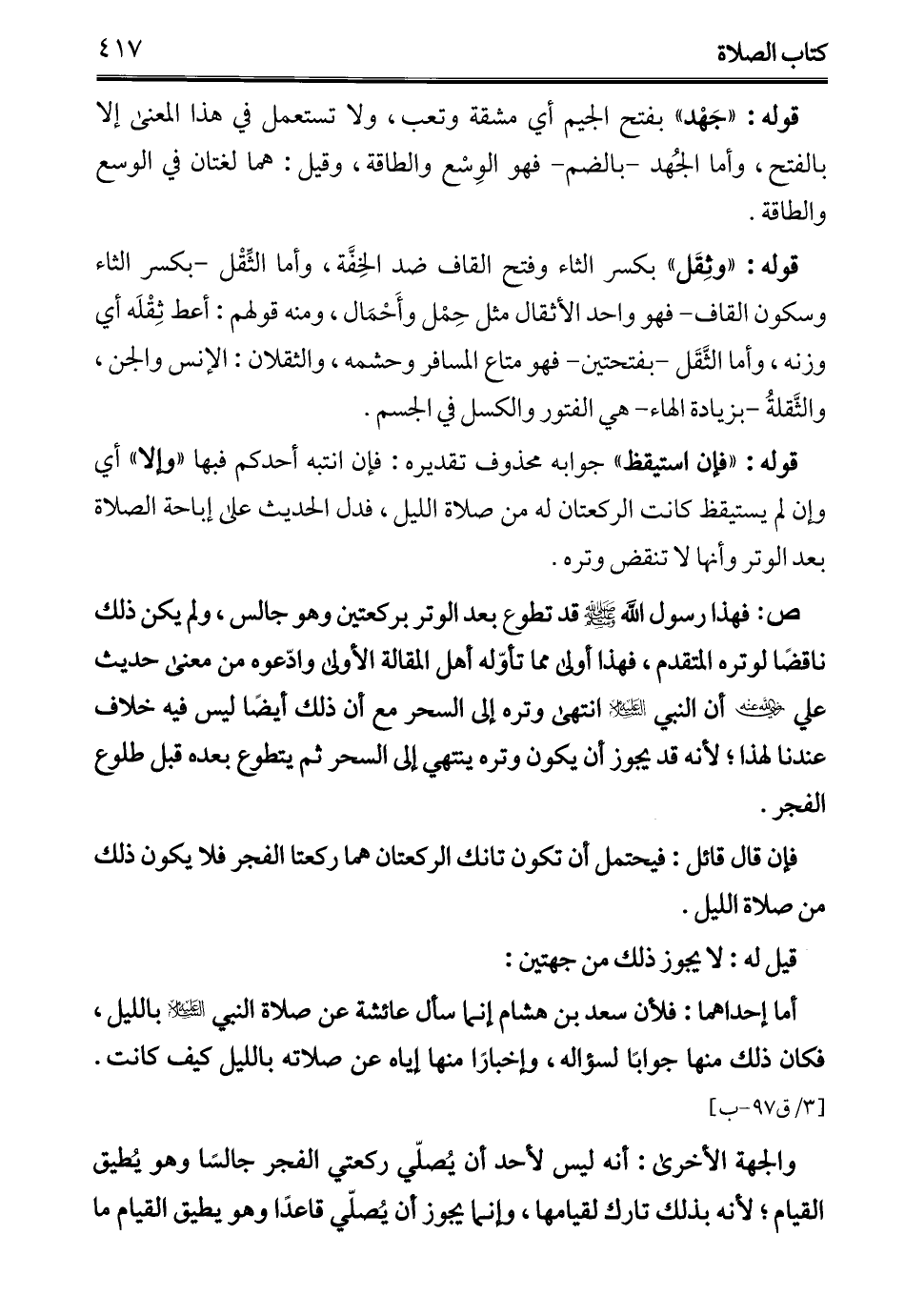 ص: فهذا رسول الله - صلى الله عليه وسلم - قد تطوع بعد الوتر بركعتين وهو جالس، ولم يكن ذلك ناقضًا لوتره المتقدم، فهذا أولى مما تأوّله أهل المقالة الأولى وادّعوه من معنى حديث علي - رضي الله عنه - أن النبي - عليه السلام - انتهى وتره إلى السحر مع أن ذلك أيضًا ليس فيه خلاف عندنا لهذا؛ لأنه قد يجوز أن يكون وتره ينتهي إلى السحر ثم يتطوع بعده قبل طلوع الفجر.