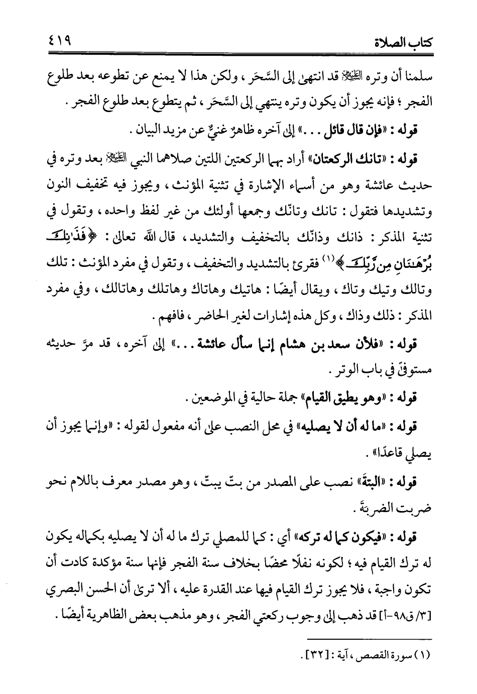 قوله: "تانك الركعتان" أراد بهما الركعتين اللتين صلاهما النبي - عليه السلام - بعد وتره في حديث عائشة وهو من أسماء الإشارة في تثنية المؤنث، ويجوز فيه تخفيف النون وتشديدها فتقول: تانك وتانّك وجمعها أولئك من غير لفظ واحده، وتقول في تثنية المذكر: ذانك وذانّك بالتخفيف والتشديد، قال الله تعالى: {فَذَانِكَ بُرْهَانَانِ مِنْ رَبِّكَ} (¬1) فقرئ بالتشديد والتخفيف، وتقول في مفرد المؤنث: تلك وتالك وتيك وتاك، ويقال أيضًا: هاتيك وهاتاك وهاتلك وهاتالك، وفي مفرد المذكر: ذلك وذاك، وكل هذه إشارات لغير الحاضر، فافهم.