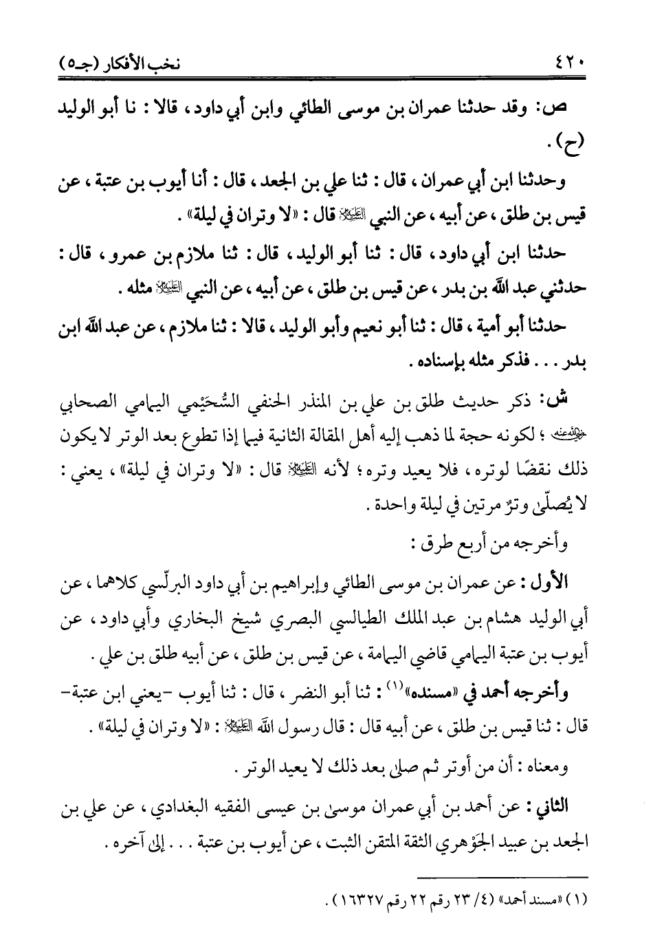 وحدثنا ابن أبي عمران، قال: ثنا علي بن الجعد، قال: أنا أيوب بن عتبة، عن قيس بن طلق، عن أبيه، عن النبي - عليه السلام - قال: "لا وتران في ليلة".
